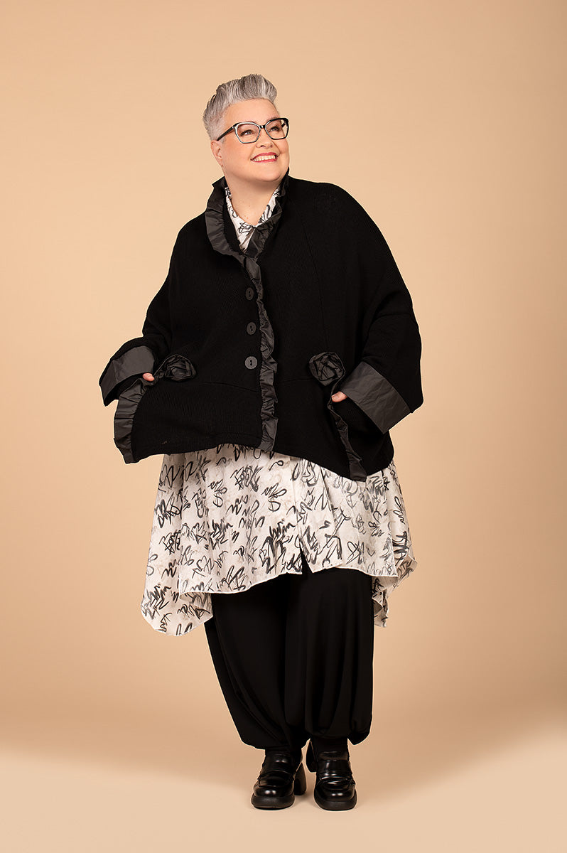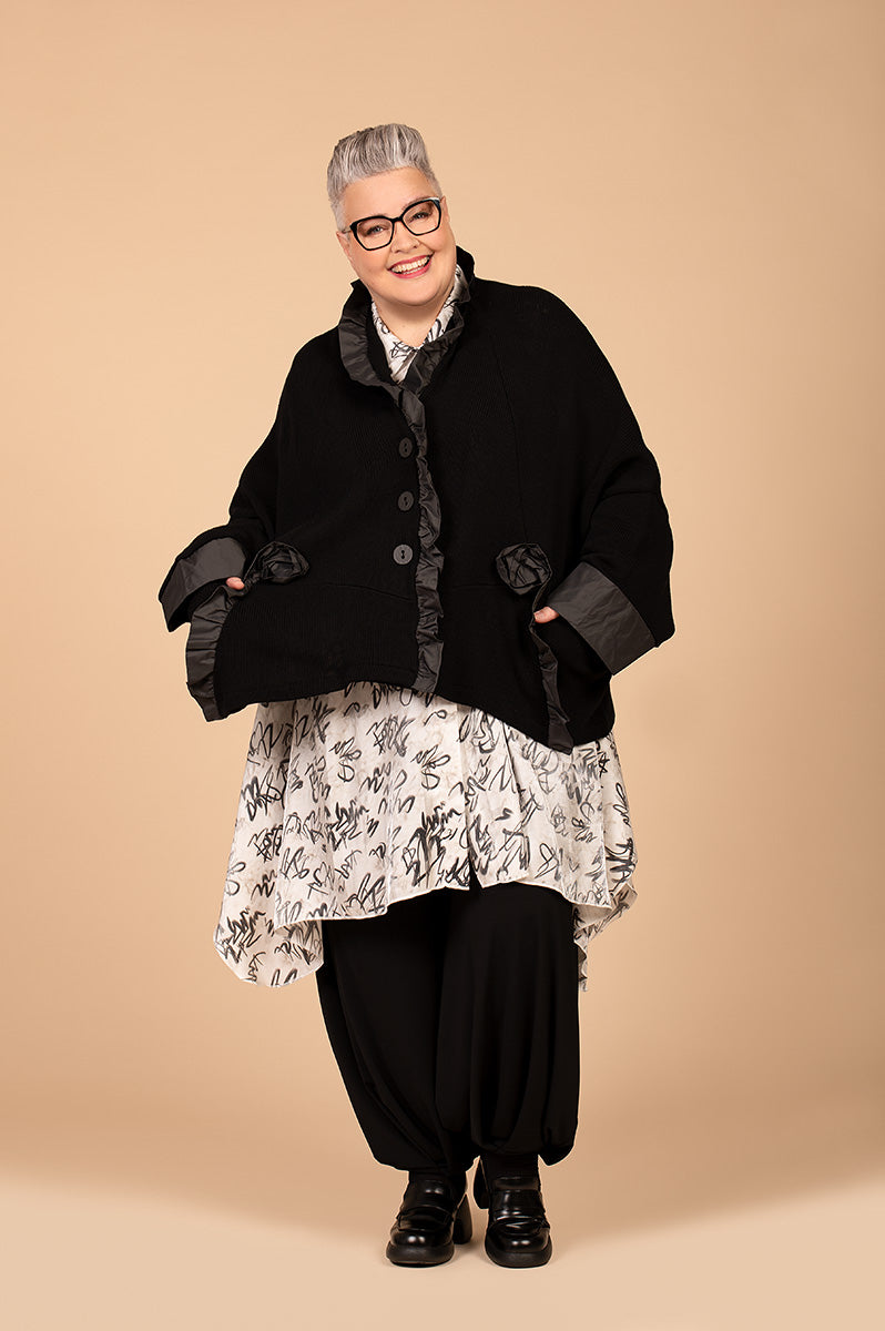 Jacket description AKH all-season jacket in a boxy shape made of soft knit quality. One size fits all, wearable up to EU size 68, is also popular with customers with smaller sizes for oversized or loose, casual wear.