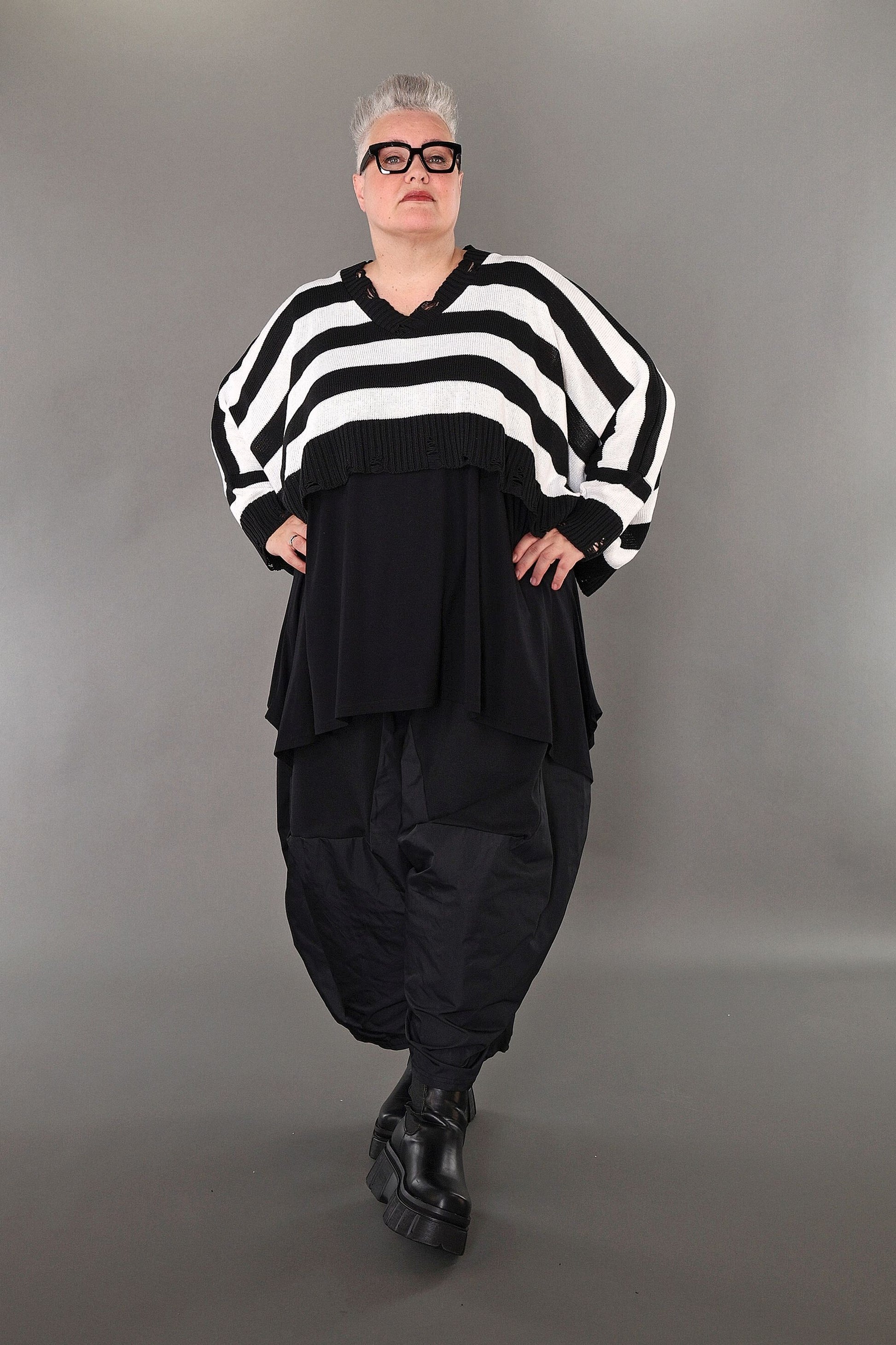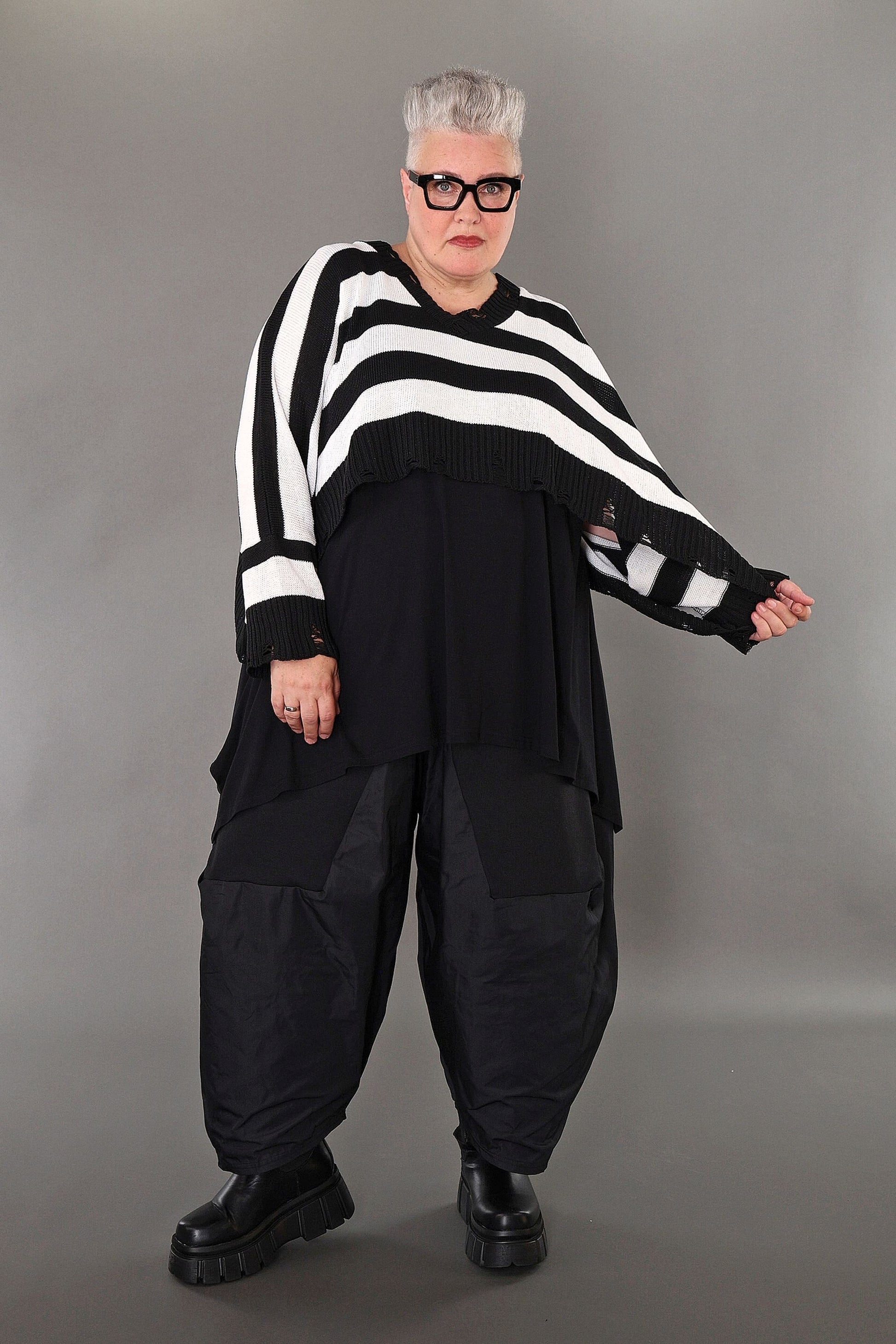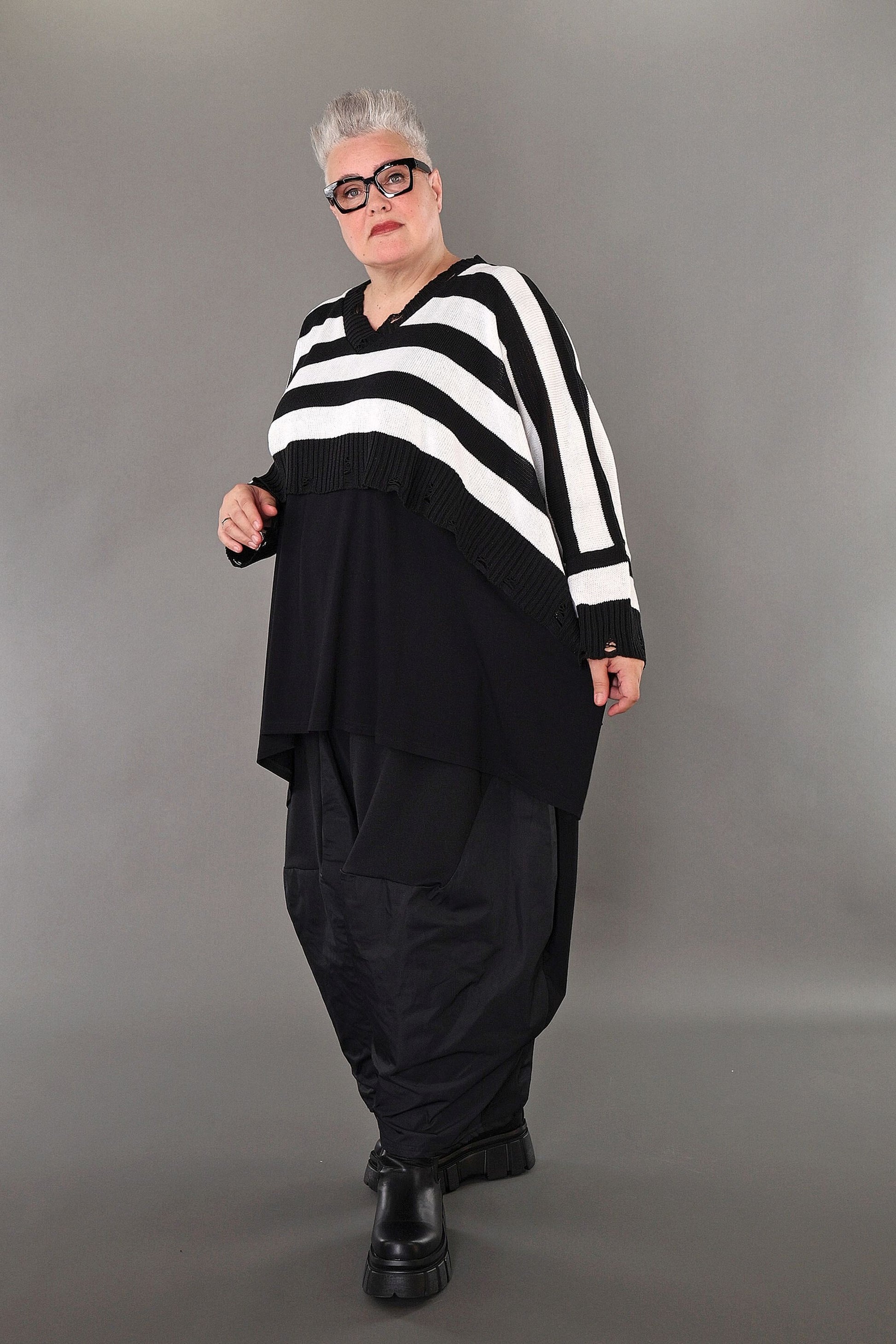 This black and white block-striped jumper adds a fun pop to your wardrobe! Made from soft, cosy knit fabric, it’s comfy and stretchy, so you can move with ease. Its relaxed boxy shape and long sleeves make it a go-to for any season. With a playful crossed V-neck and trendy distressed edges on the collar and hem, it brings a fresh, modern twist to your look.