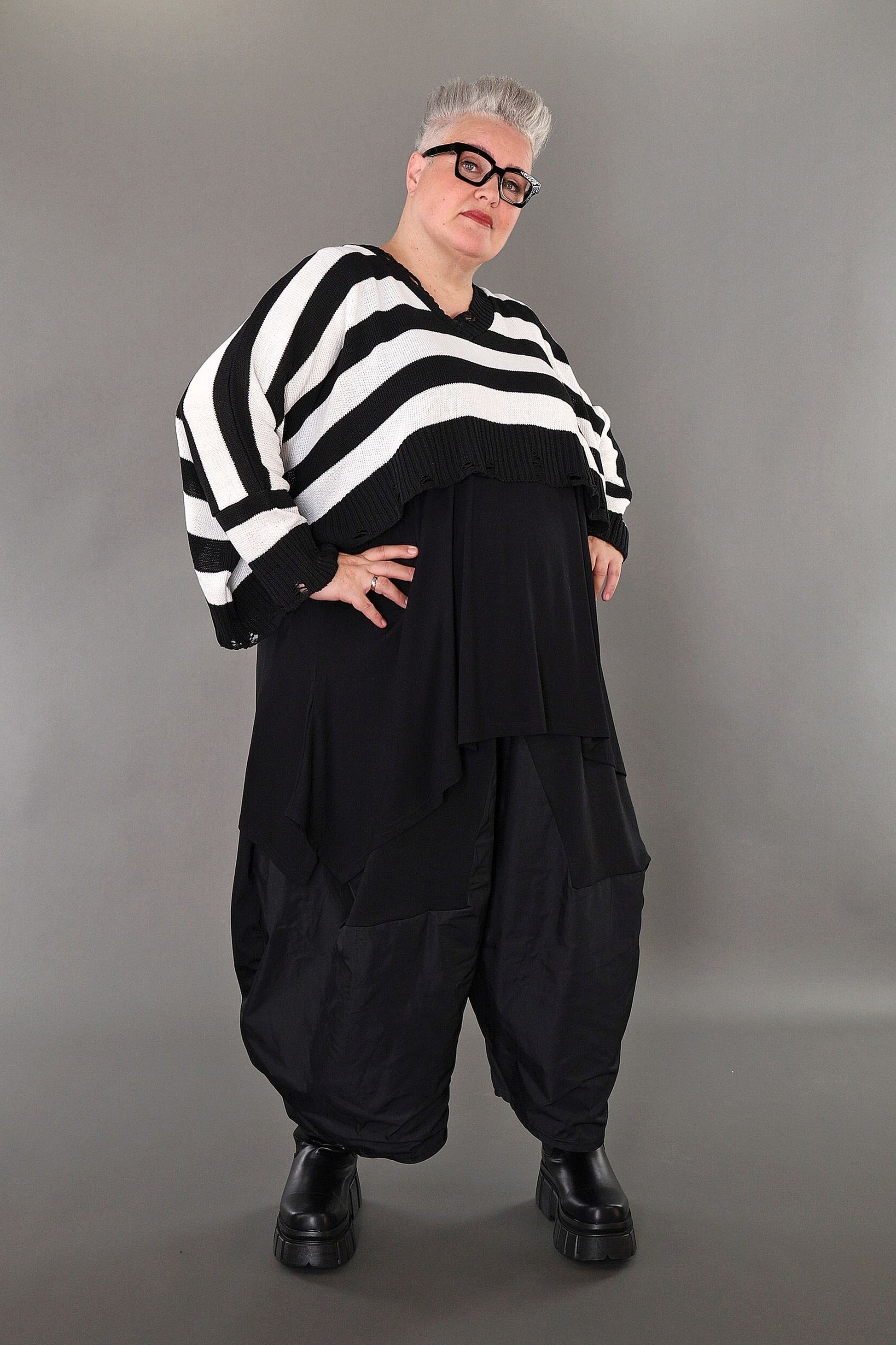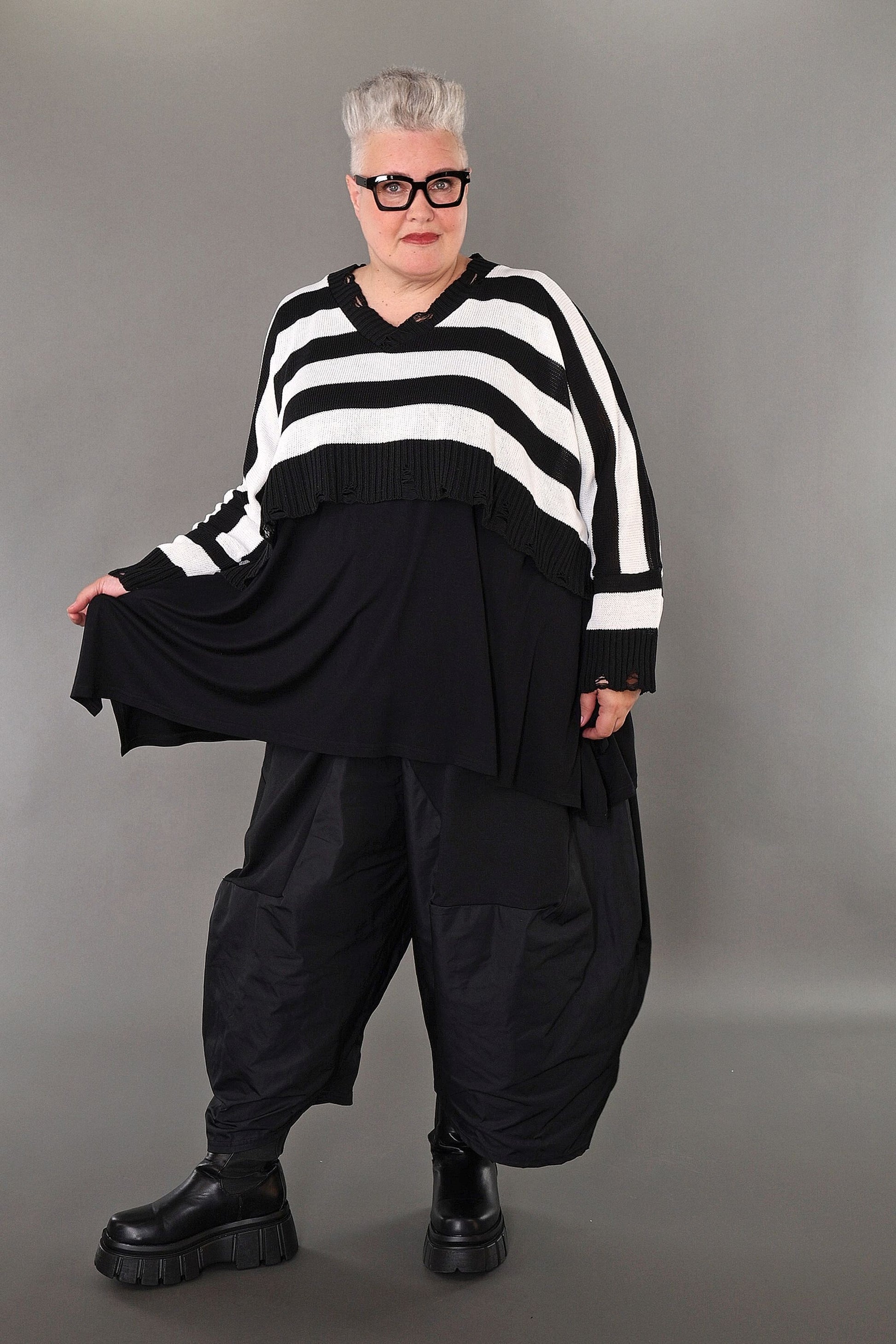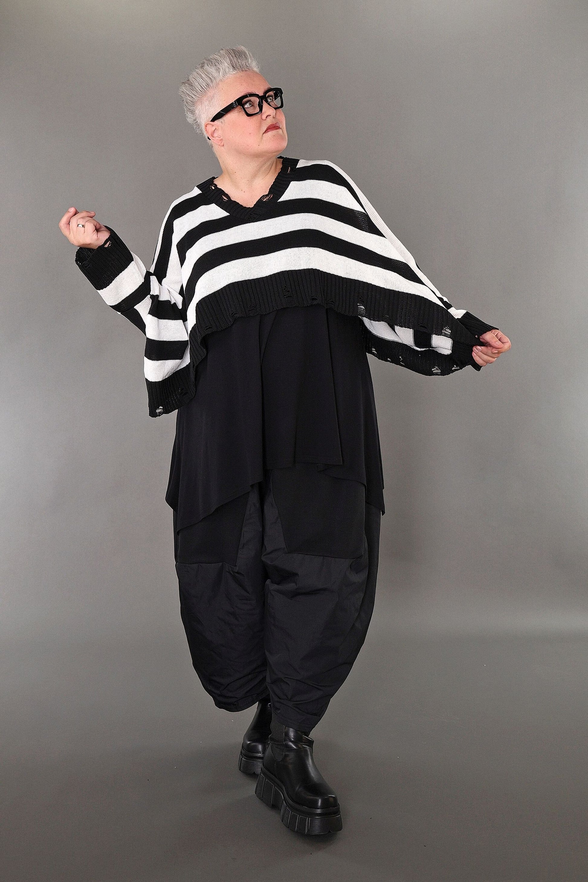 This black and white block-striped jumper adds a fun pop to your wardrobe! Made from soft, cosy knit fabric, it’s comfy and stretchy, so you can move with ease. Its relaxed boxy shape and long sleeves make it a go-to for any season. With a playful crossed V-neck and trendy distressed edges on the collar and hem, it brings a fresh, modern twist to your look.