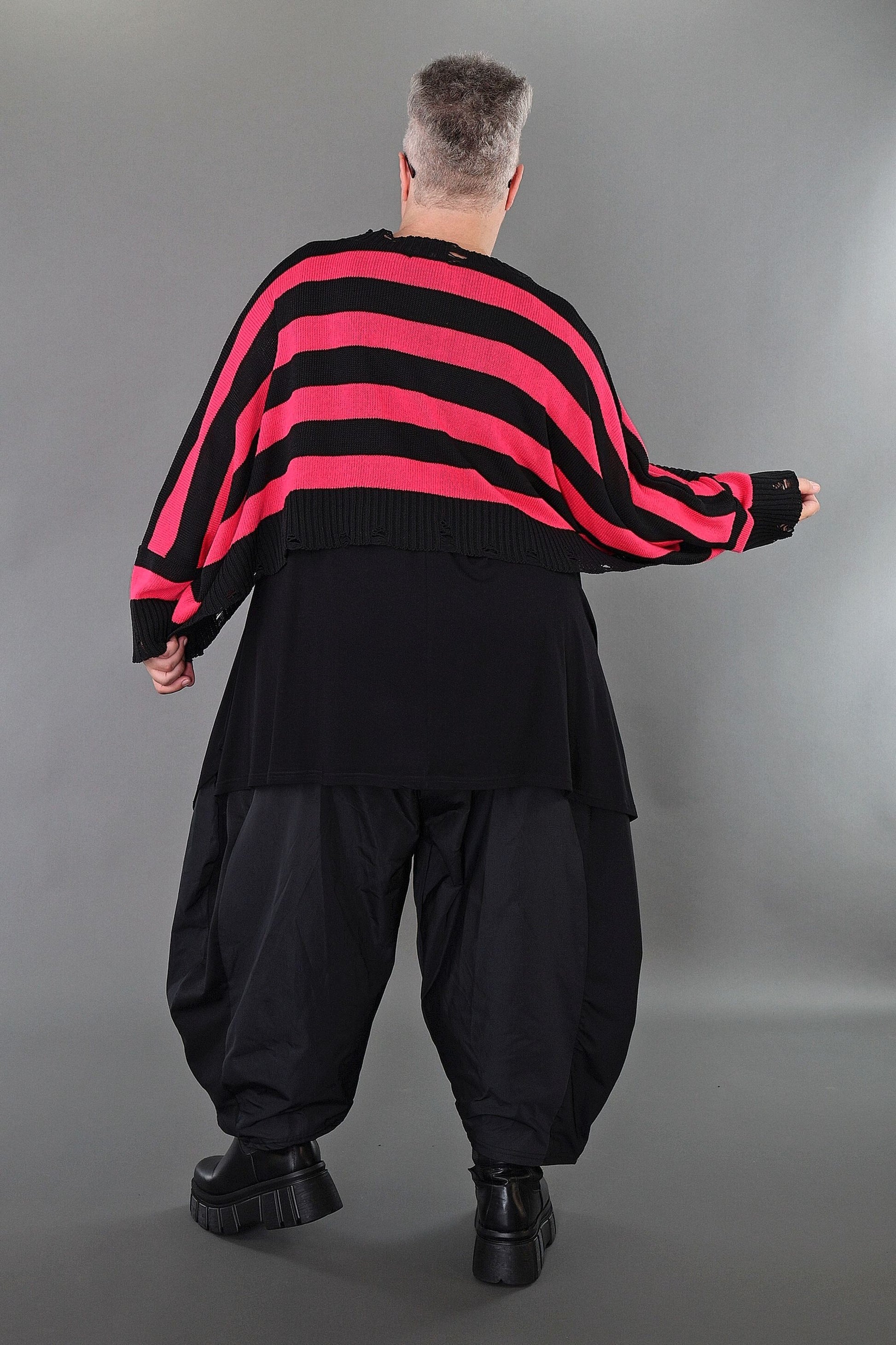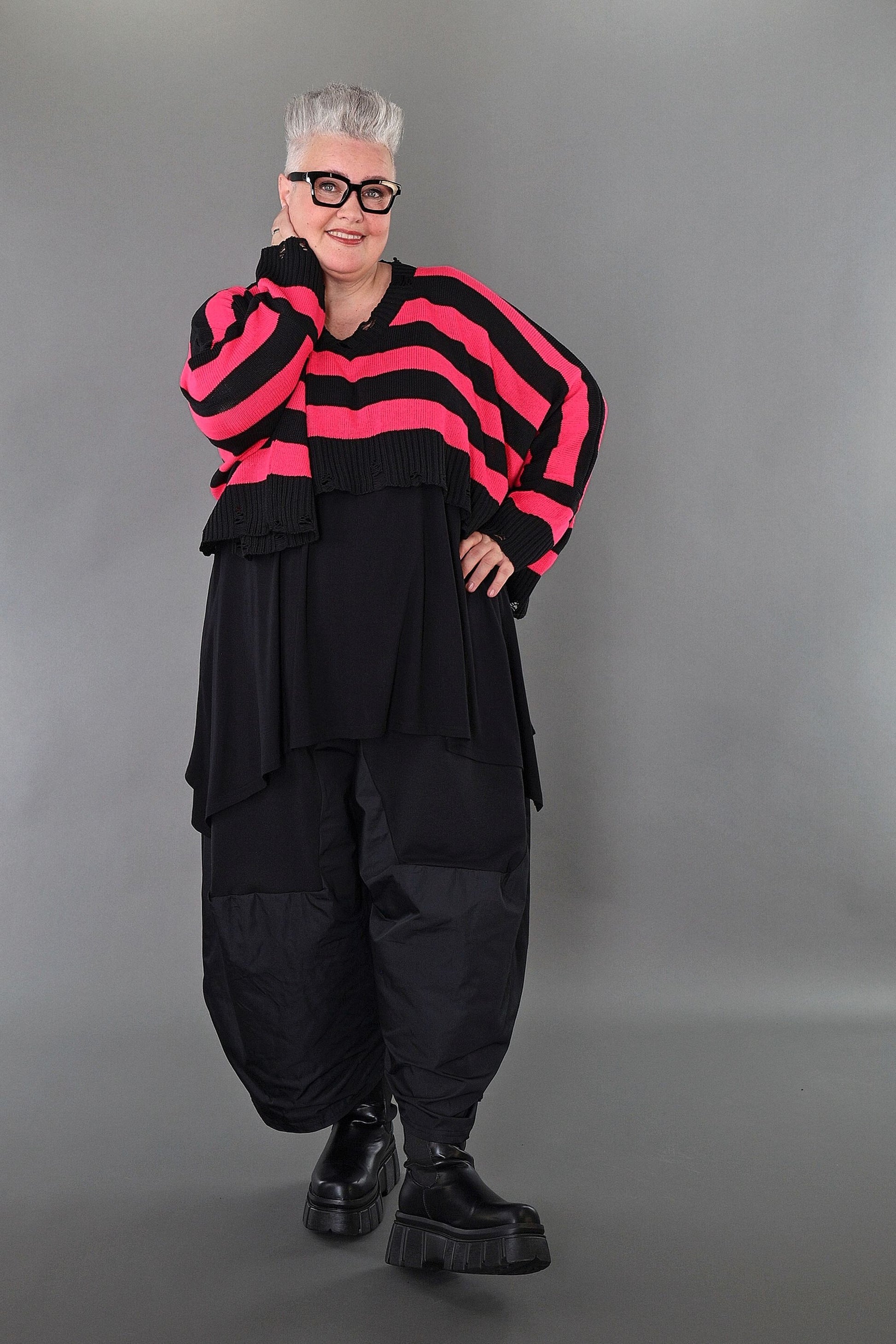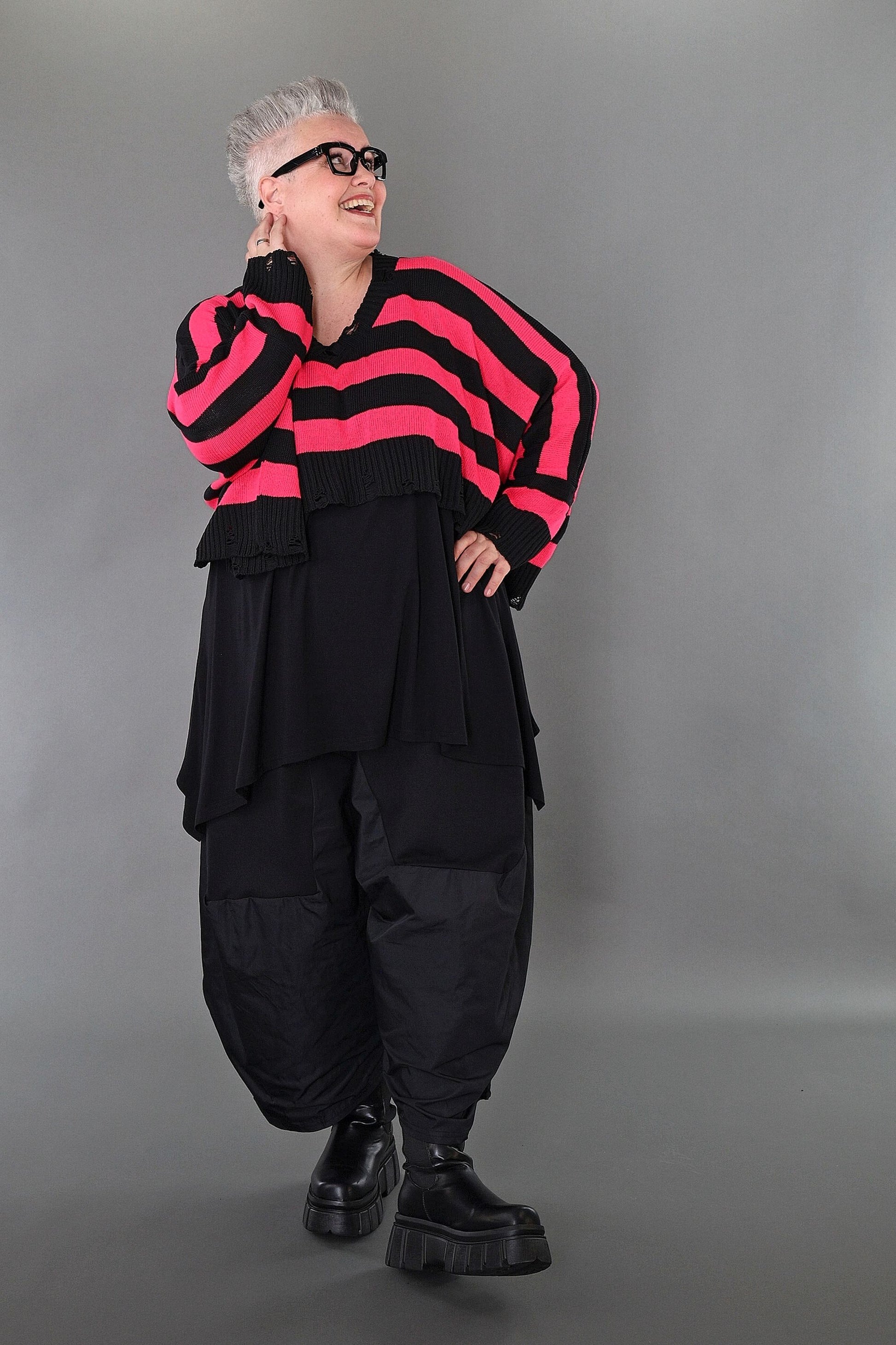 This black and white block-striped jumper adds a fun pop to your wardrobe! Made from soft, cosy knit fabric, it’s comfy and stretchy, so you can move with ease. Its relaxed boxy shape and long sleeves make it a go-to for any season. With a playful crossed V-neck and trendy distressed edges on the collar and hem, it brings a fresh, modern twist to your look.