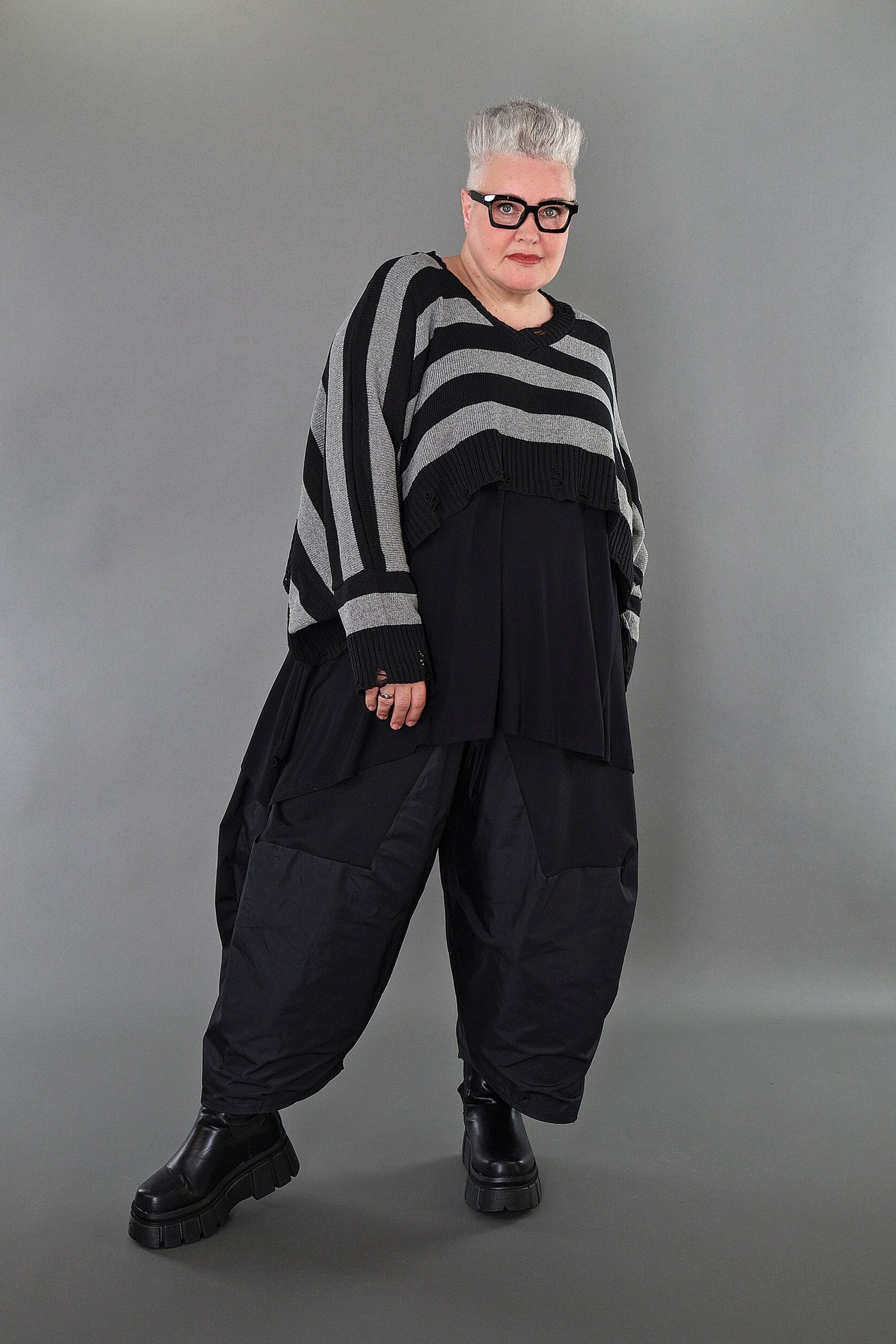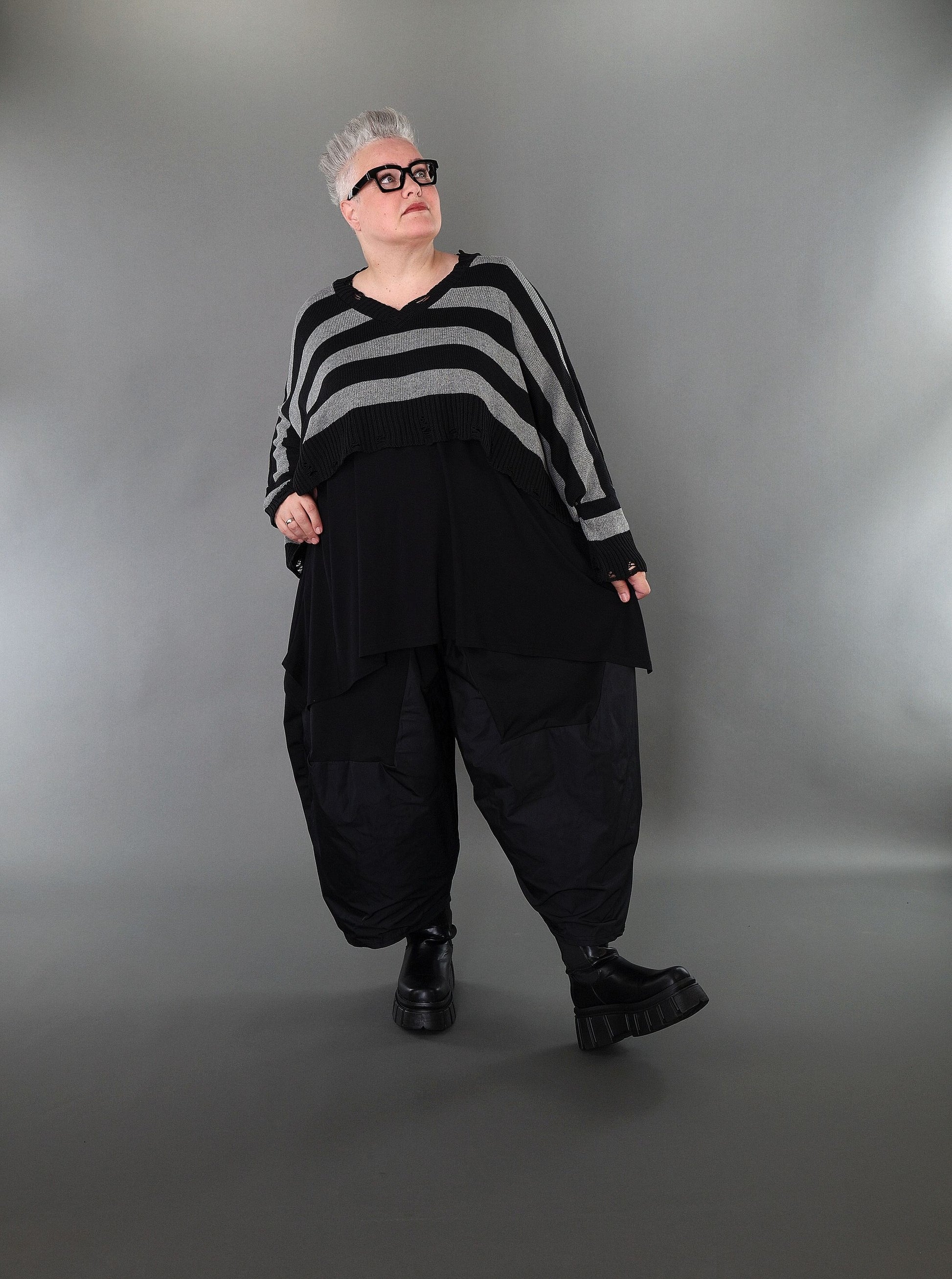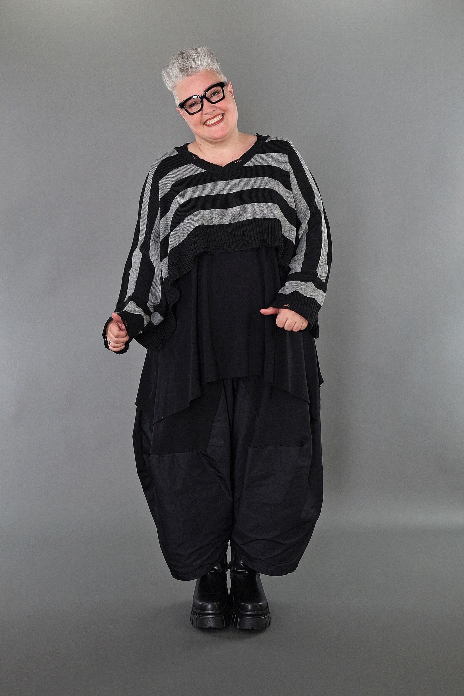 This black and white block-striped jumper adds a fun pop to your wardrobe! Made from soft, cosy knit fabric, it’s comfy and stretchy, so you can move with ease. Its relaxed boxy shape and long sleeves make it a go-to for any season. With a playful crossed V-neck and trendy distressed edges on the collar and hem, it brings a fresh, modern twist to your look.