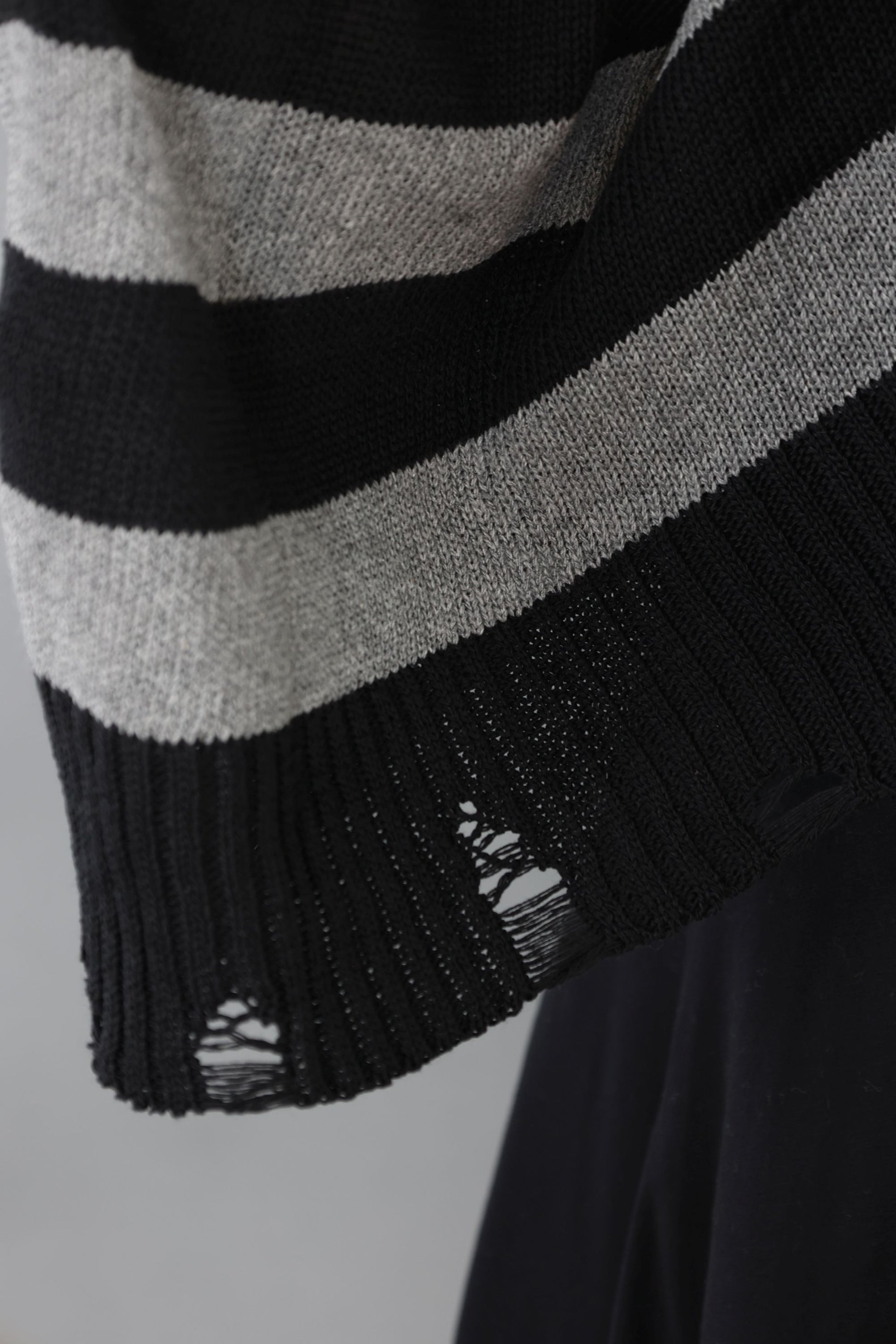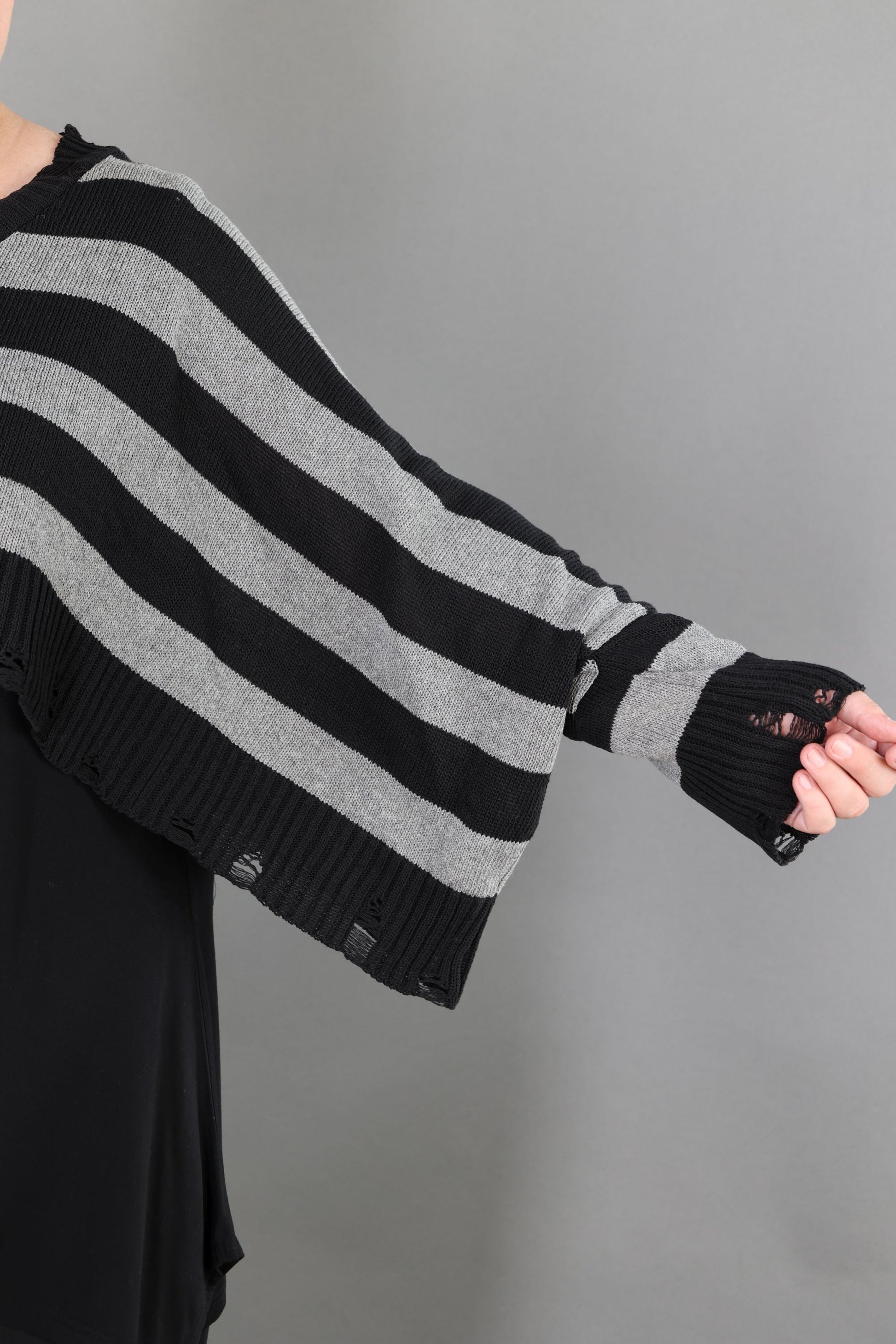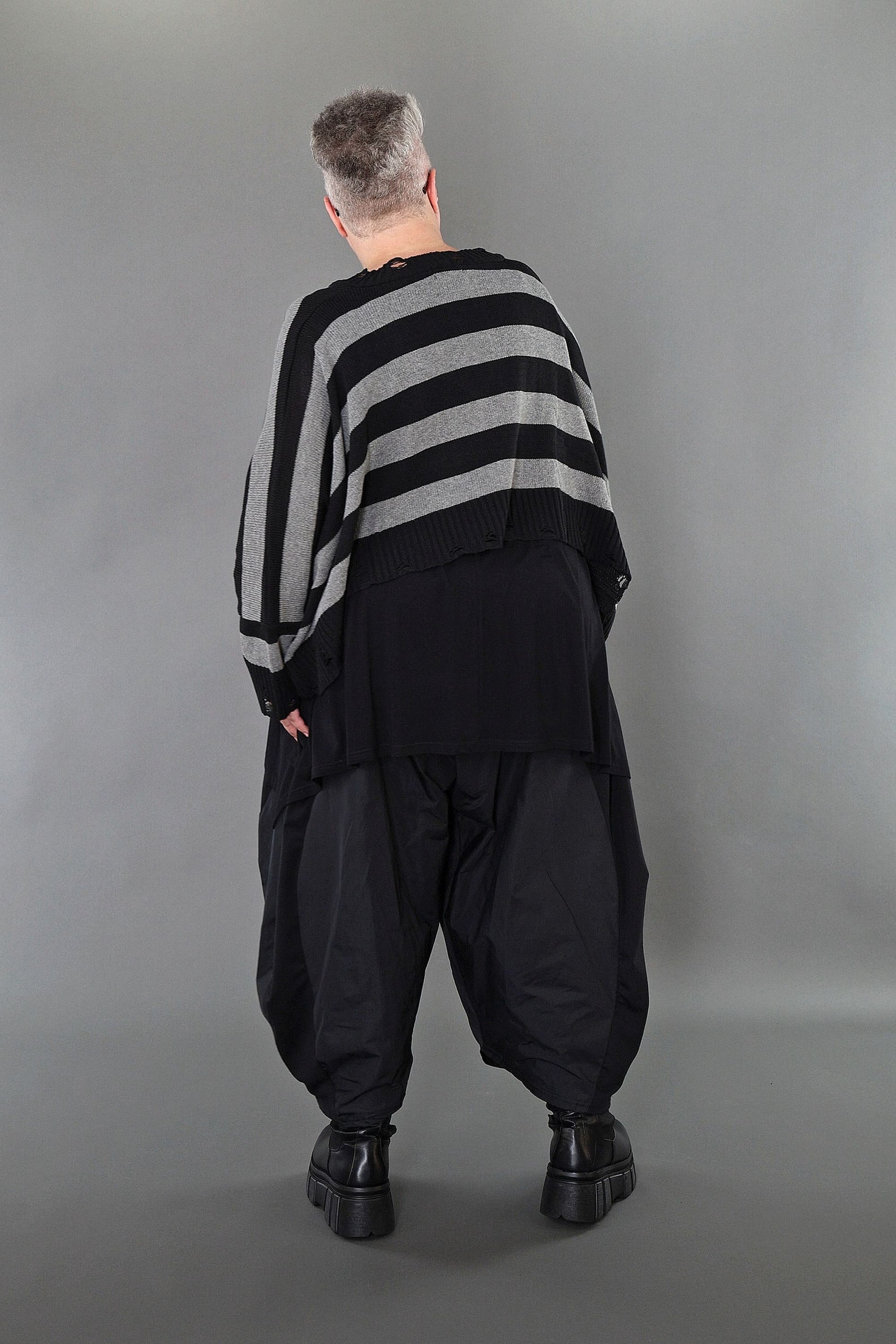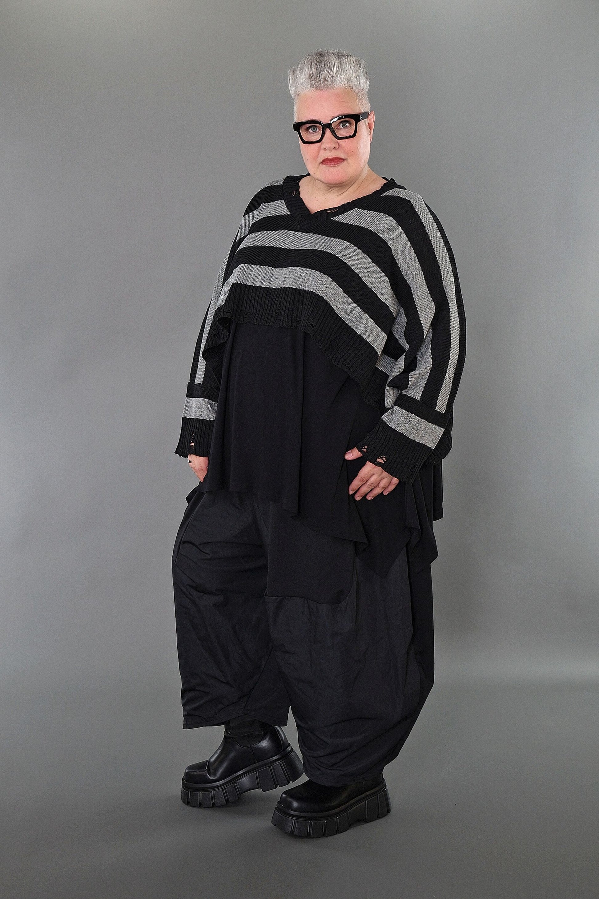 This black and white block-striped jumper adds a fun pop to your wardrobe! Made from soft, cosy knit fabric, it’s comfy and stretchy, so you can move with ease. Its relaxed boxy shape and long sleeves make it a go-to for any season. With a playful crossed V-neck and trendy distressed edges on the collar and hem, it brings a fresh, modern twist to your look.