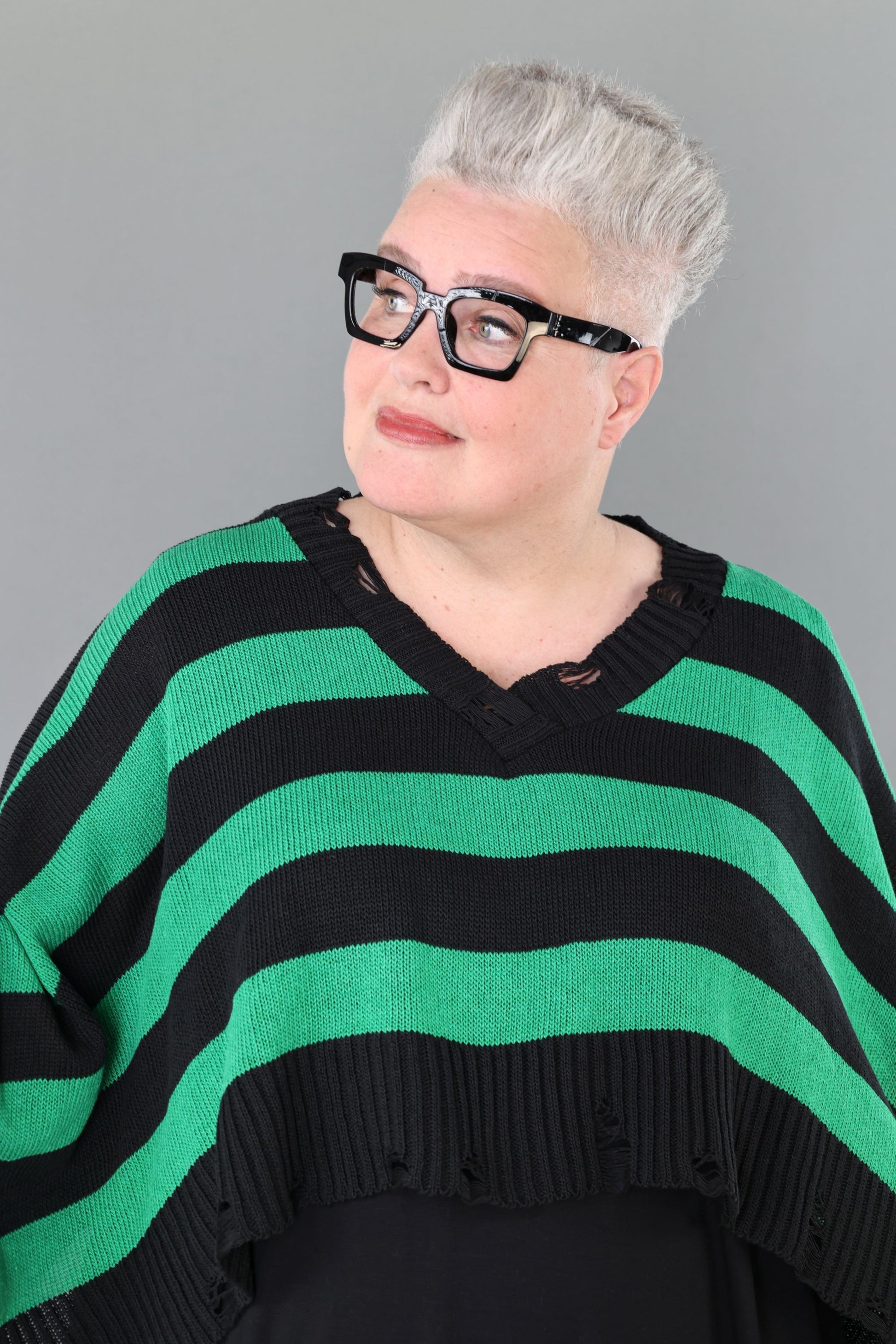 This black and white block-striped jumper adds a fun pop to your wardrobe! Made from soft, cosy knit fabric, it’s comfy and stretchy, so you can move with ease. Its relaxed boxy shape and long sleeves make it a go-to for any season. With a playful crossed V-neck and trendy distressed edges on the collar and hem, it brings a fresh, modern twist to your look.