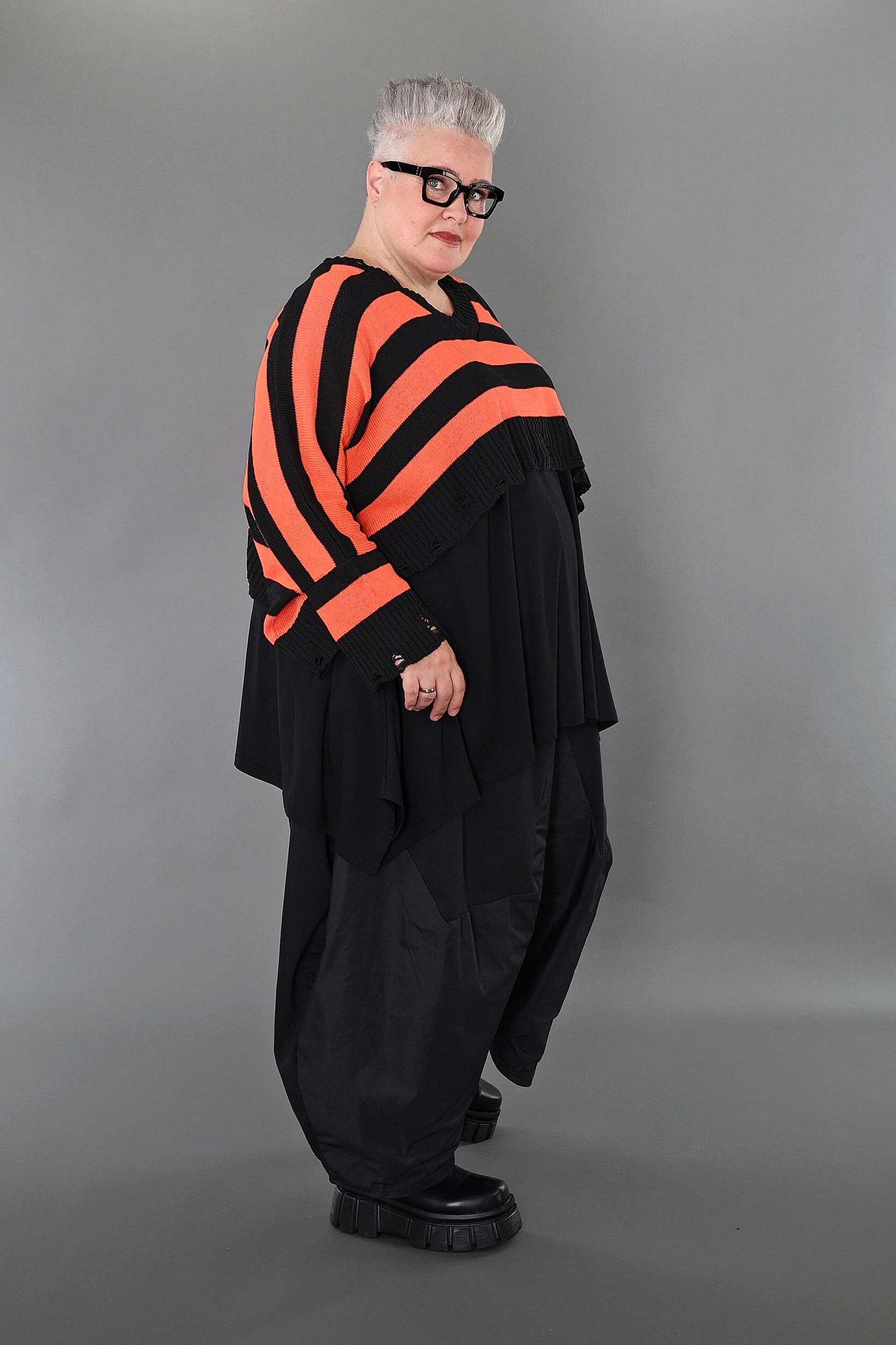 This black and white block-striped jumper adds a fun pop to your wardrobe! Made from soft, cosy knit fabric, it’s comfy and stretchy, so you can move with ease. Its relaxed boxy shape and long sleeves make it a go-to for any season. With a playful crossed V-neck and trendy distressed edges on the collar and hem, it brings a fresh, modern twist to your look.