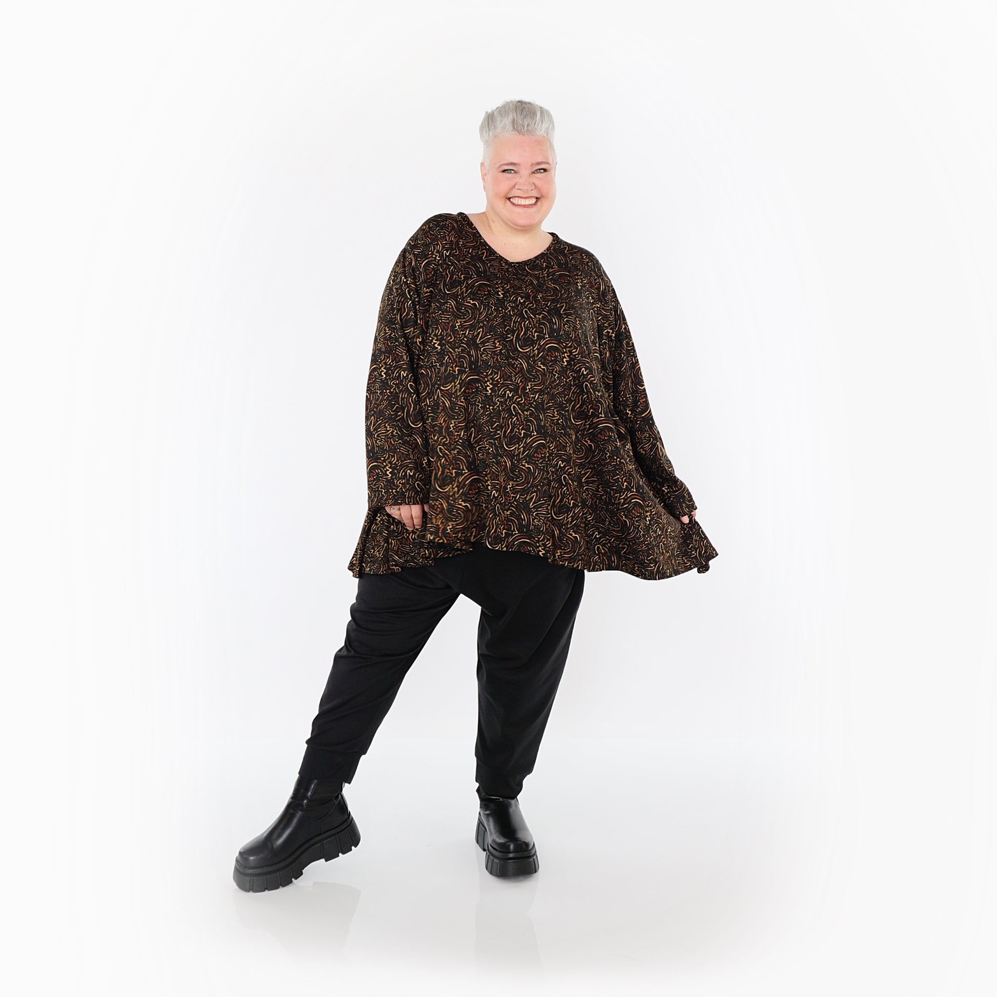 Worn by our model Regina (UK 20-24, 166cm) who can easily wear almost all AKH styles in an oversized style.