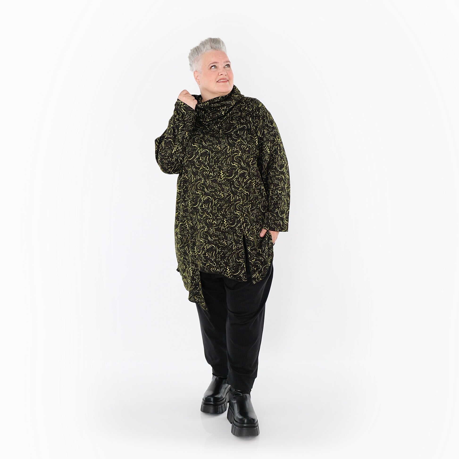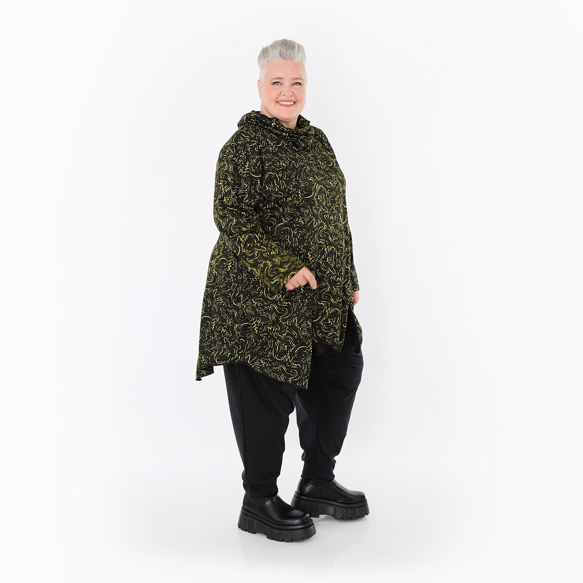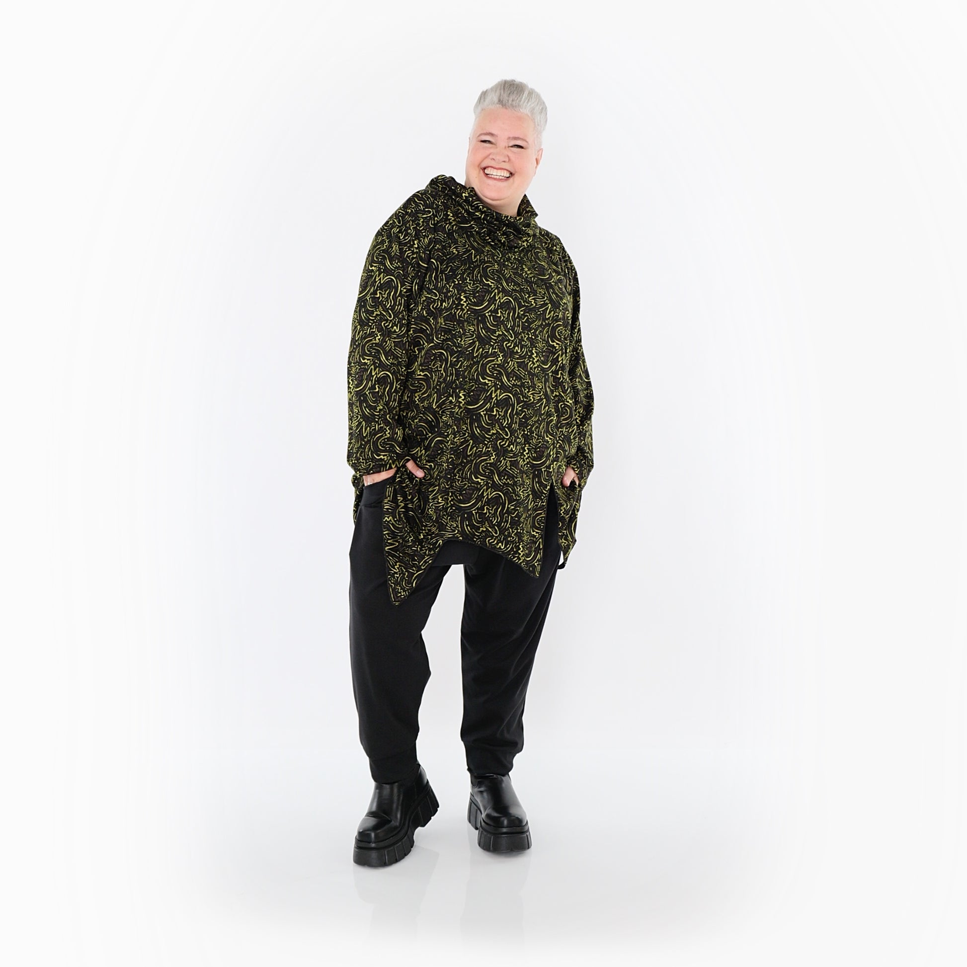 Worn by our model Regina (UK 20-24, 166cm) who can easily wear almost all AKH styles in an oversized style.