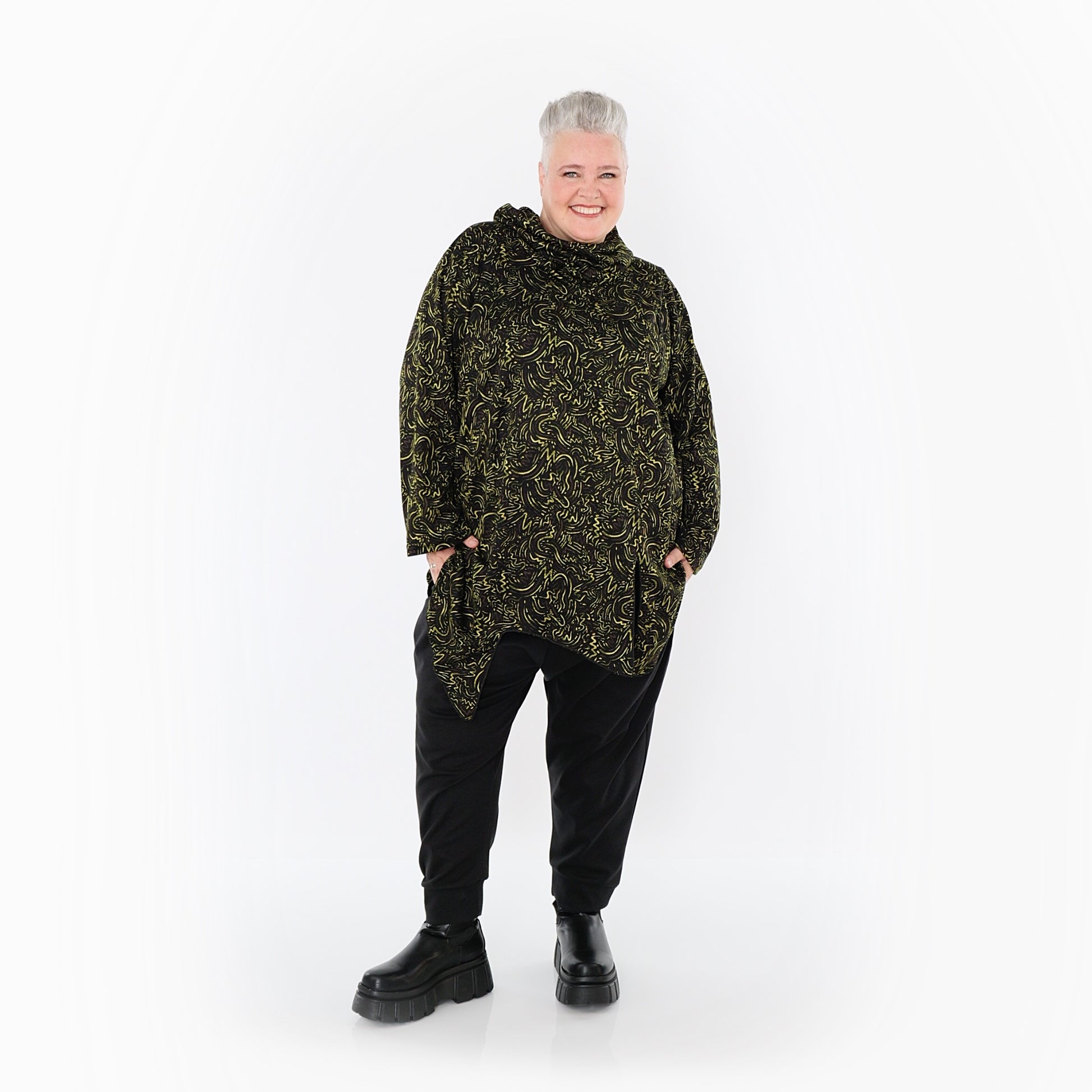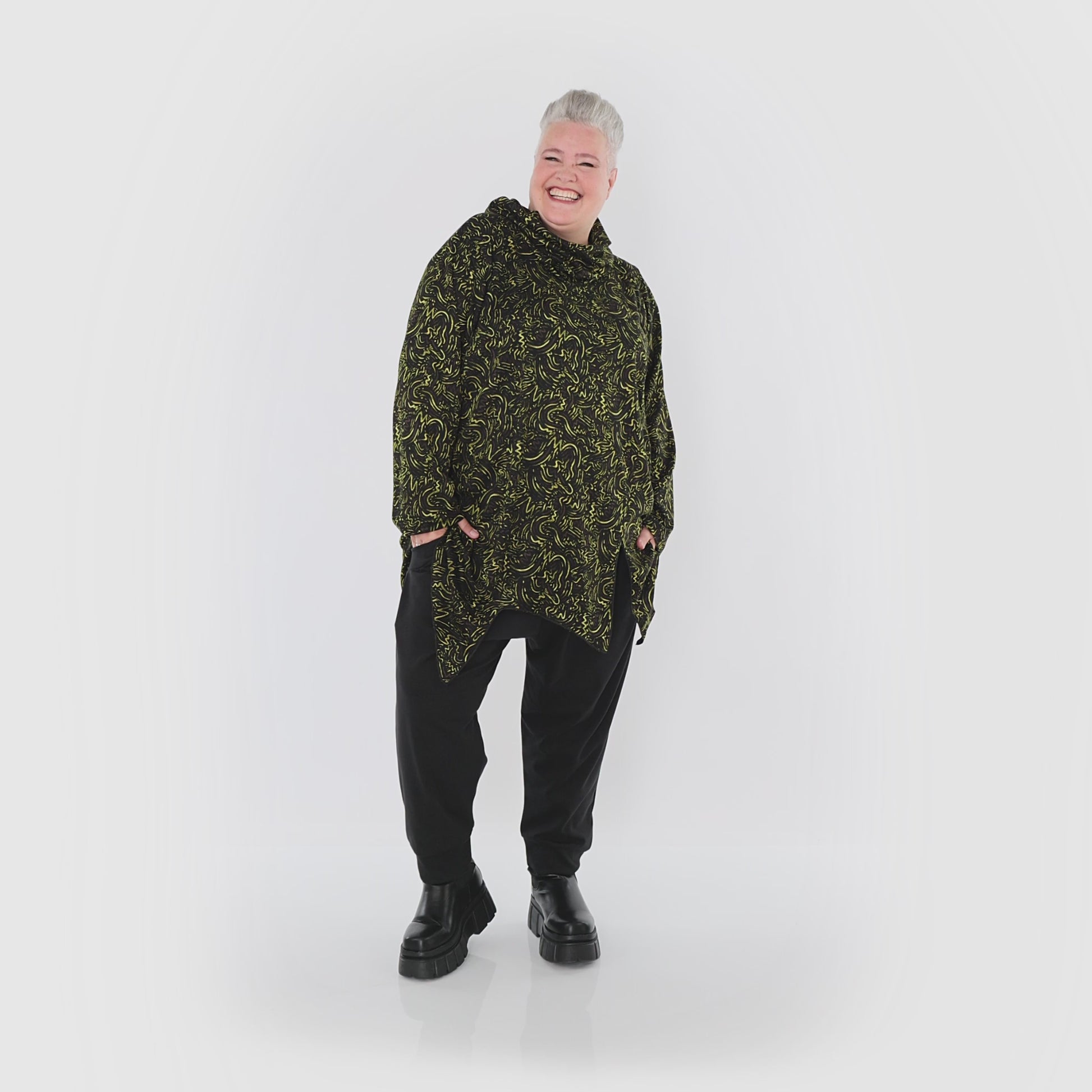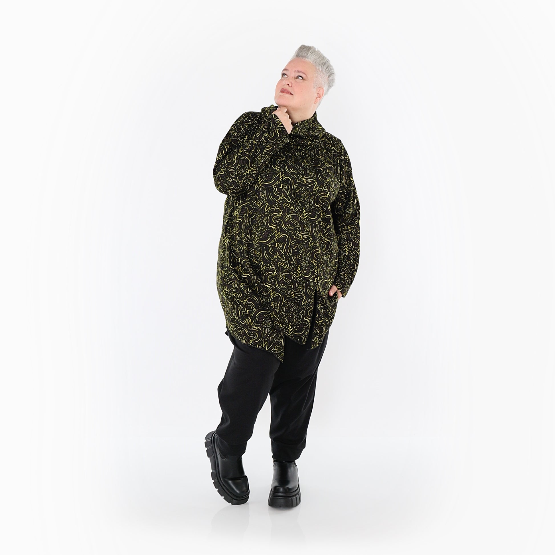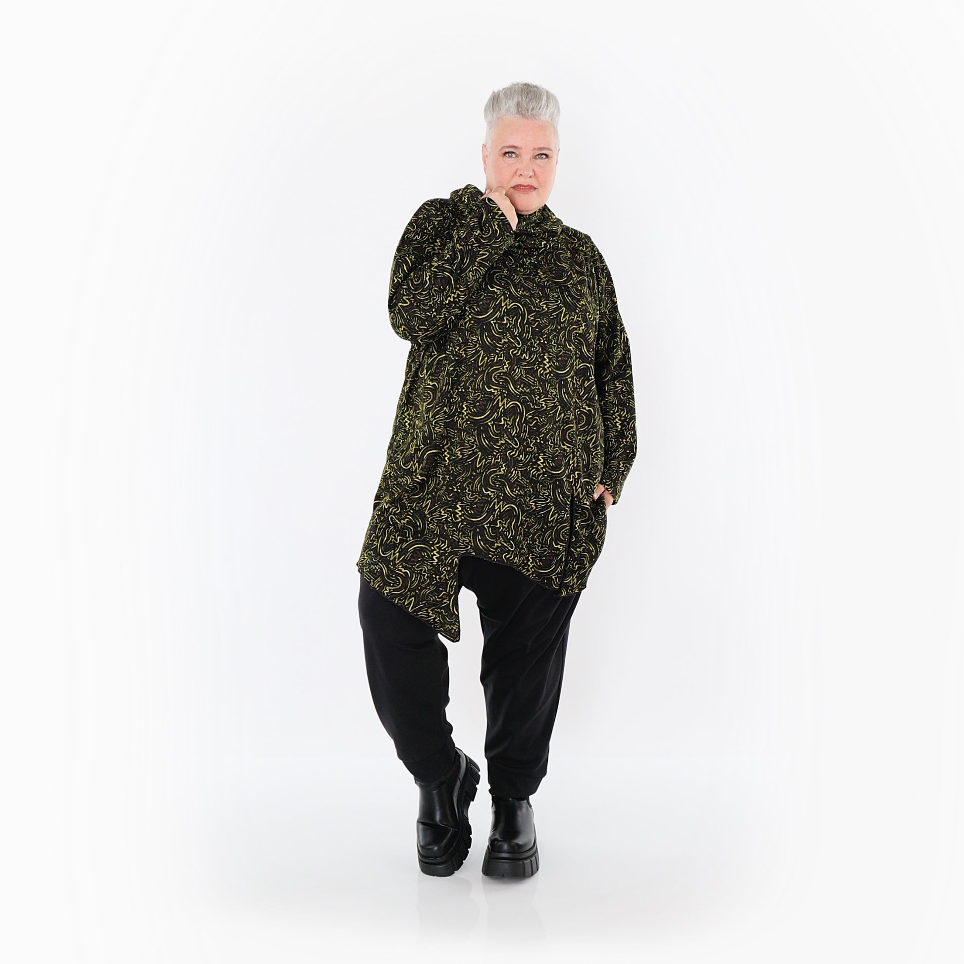 Worn by our model Regina (UK 20-24, 166cm) who can easily wear almost all AKH styles in an oversized style.