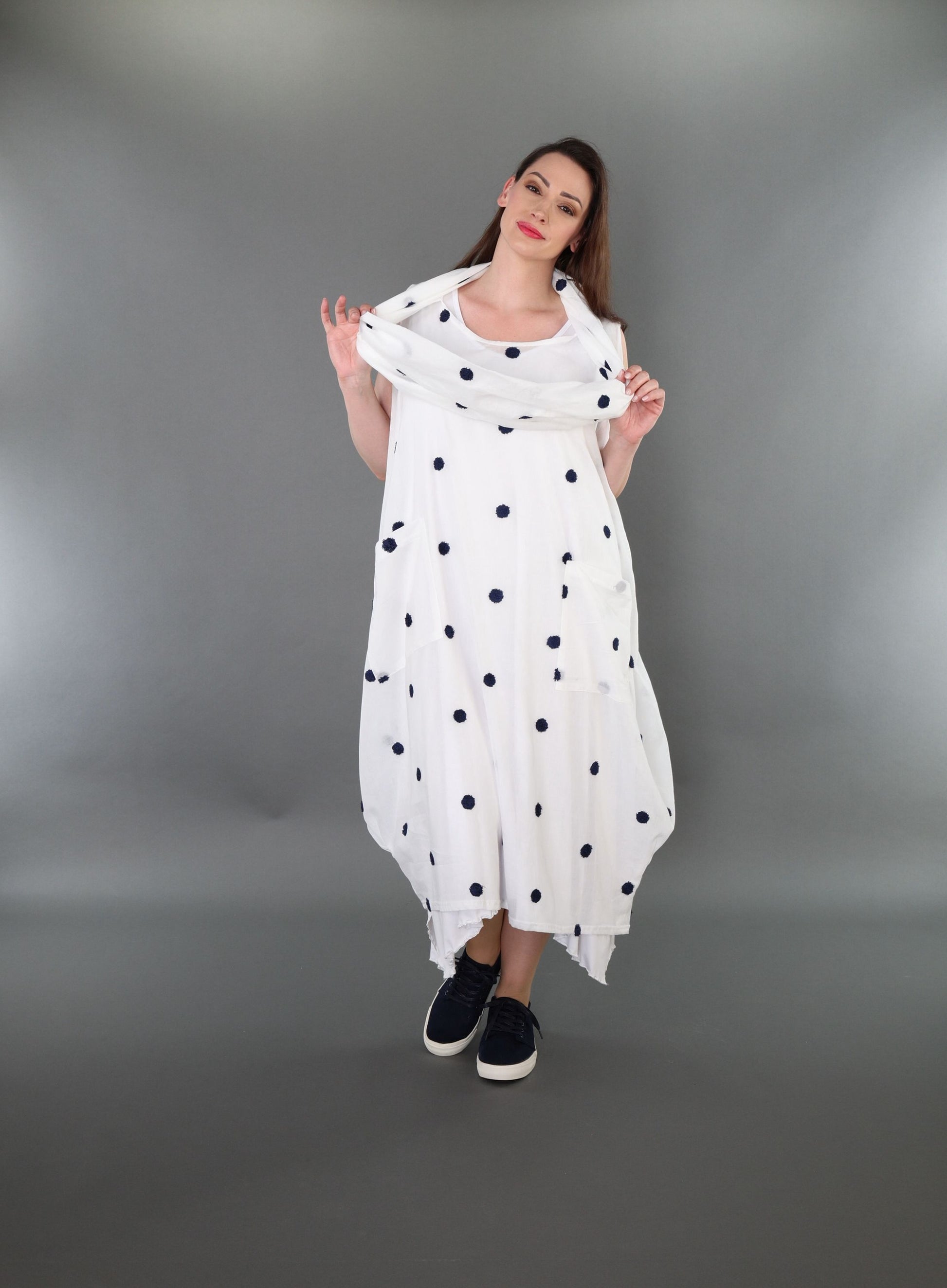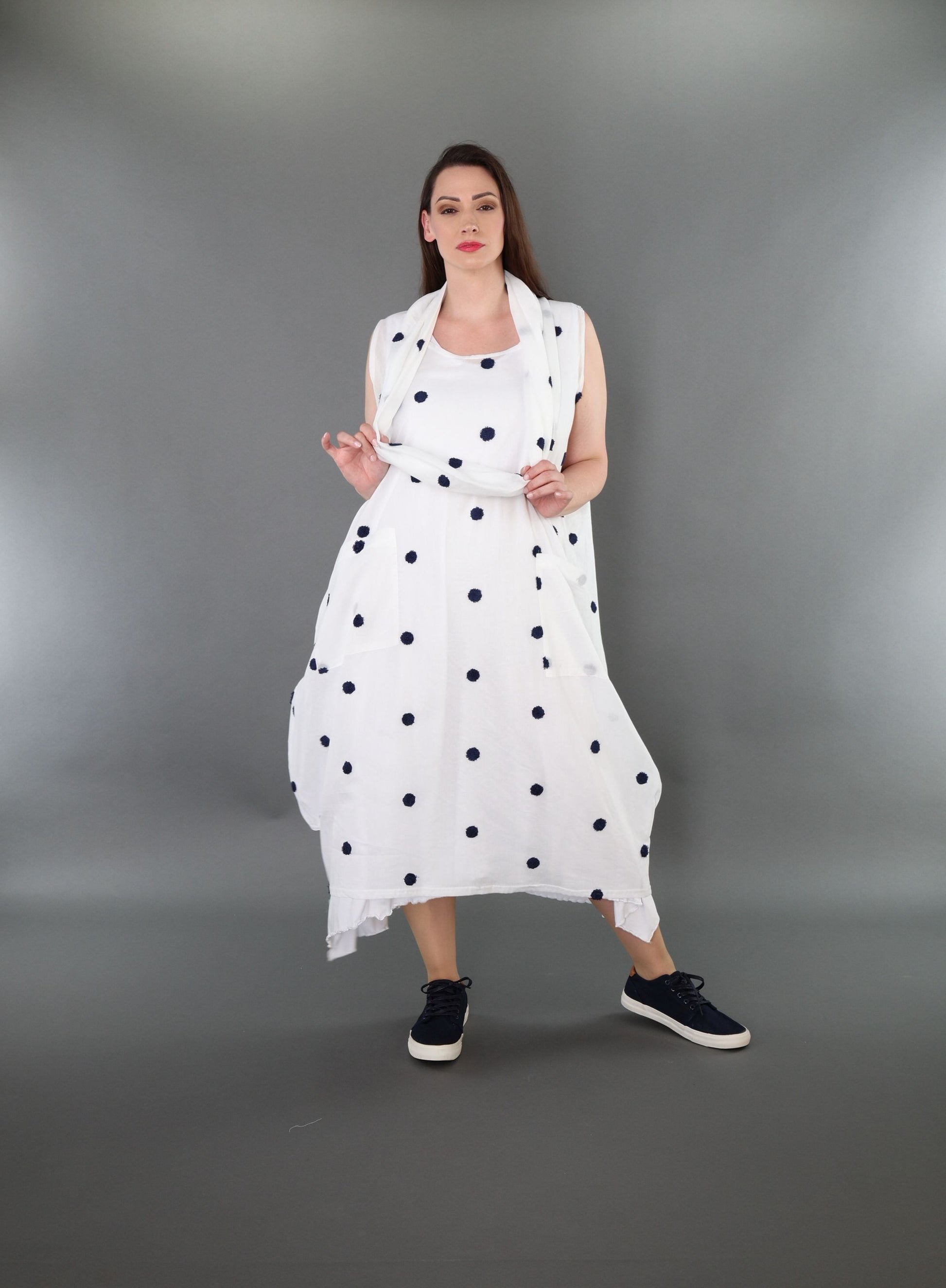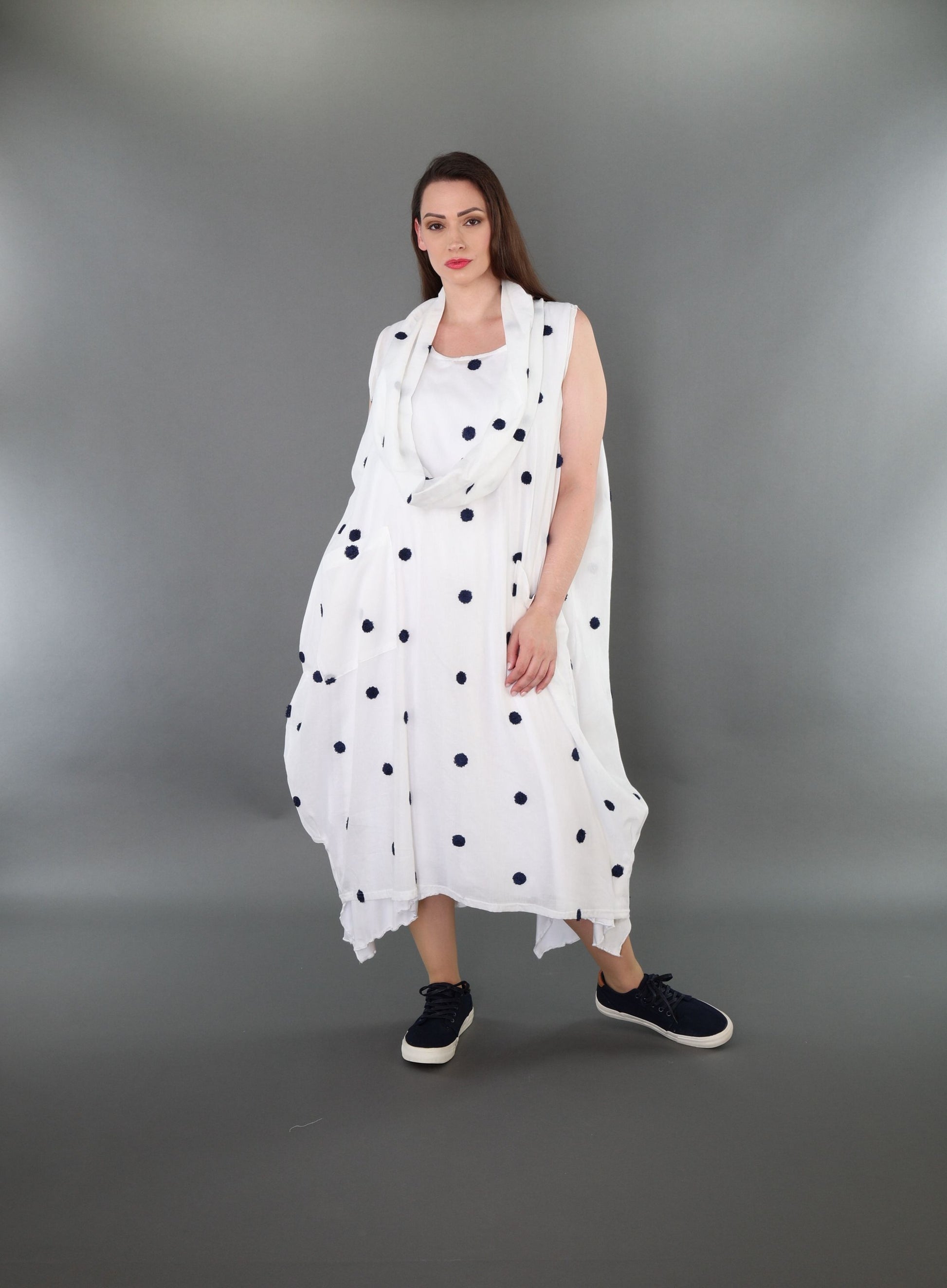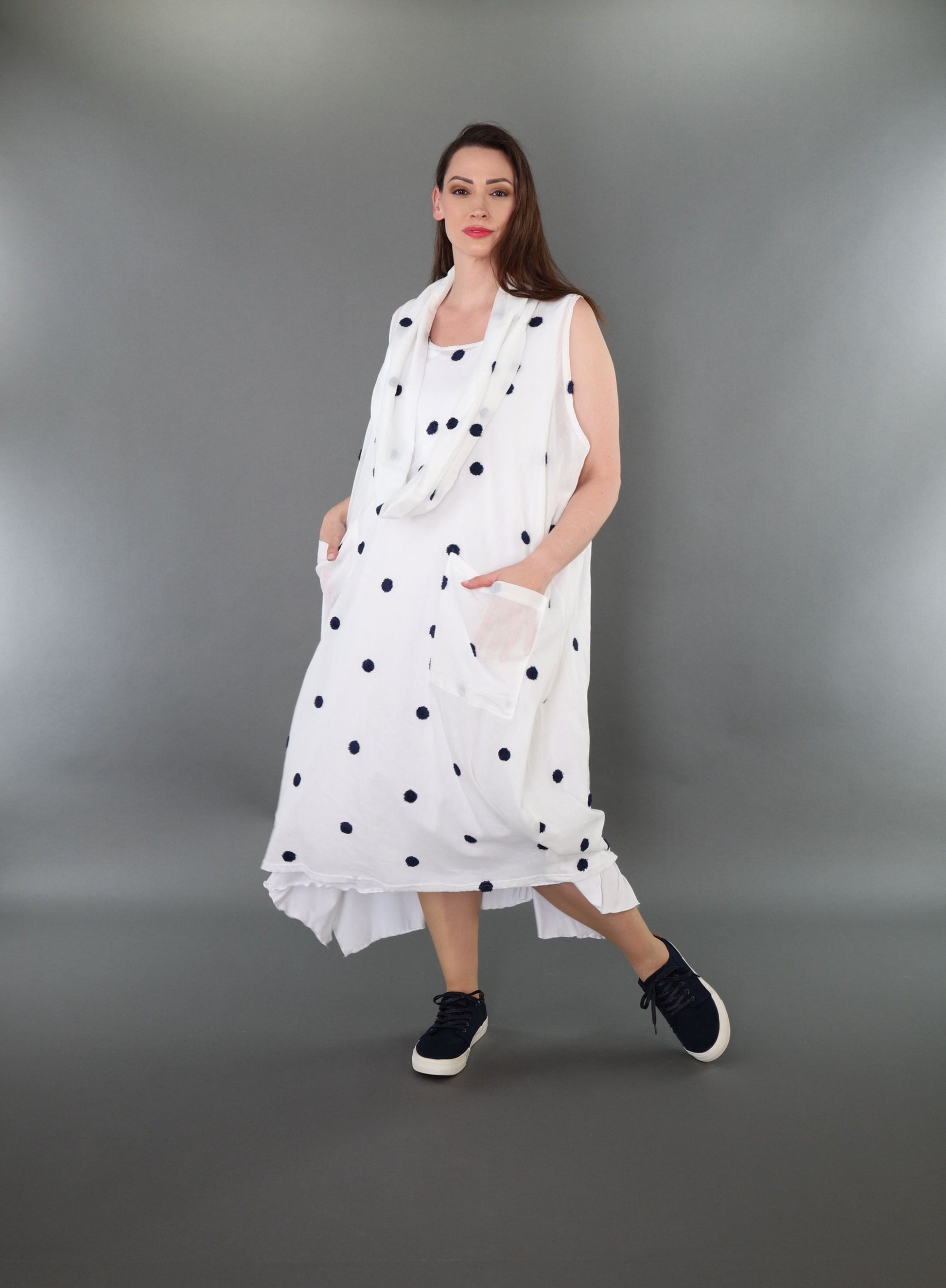 Size: One size fits all, wearable up to size 54. Total length: 120 cm. Half bust: 75 cm. Sleeve length: Sleeveless.