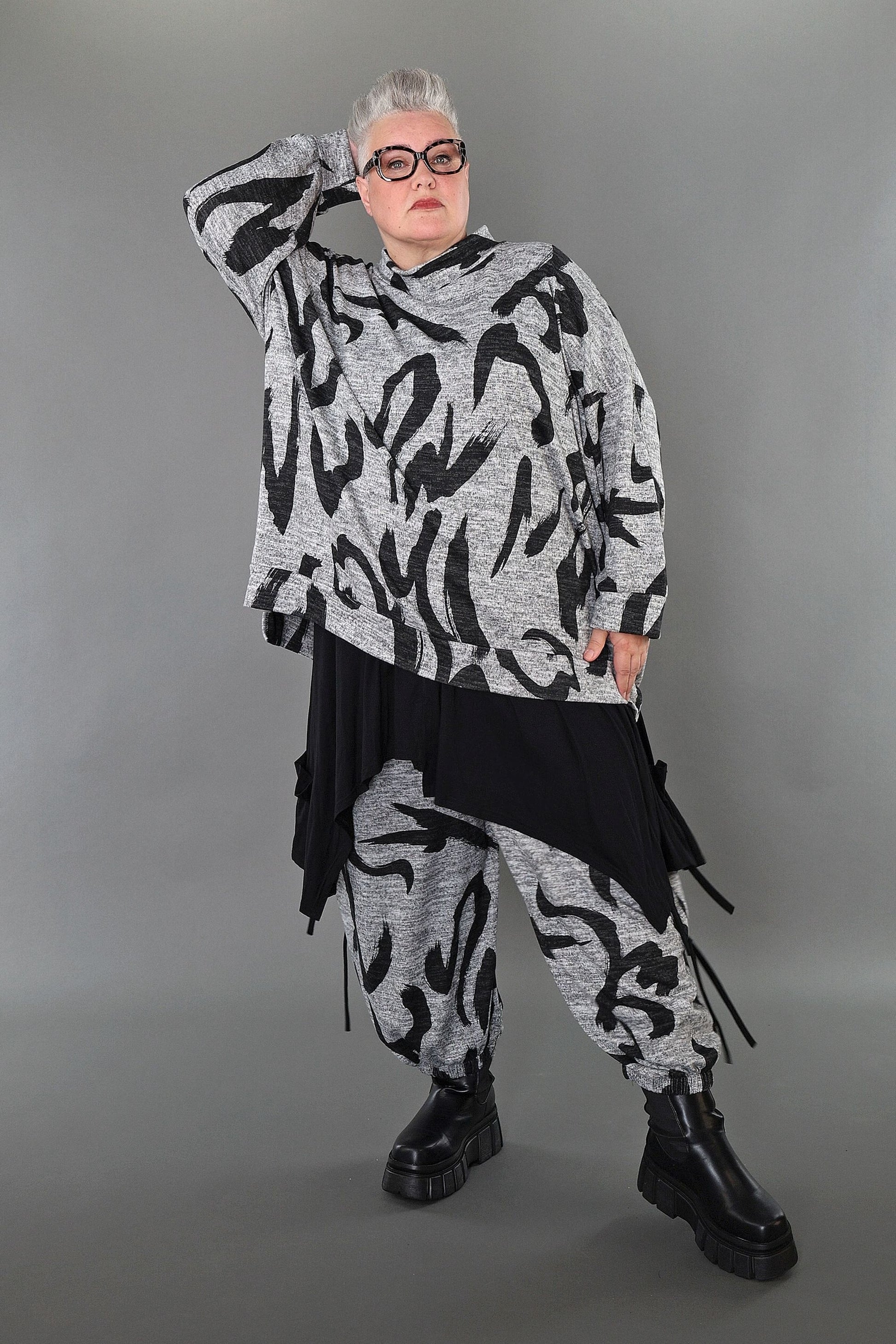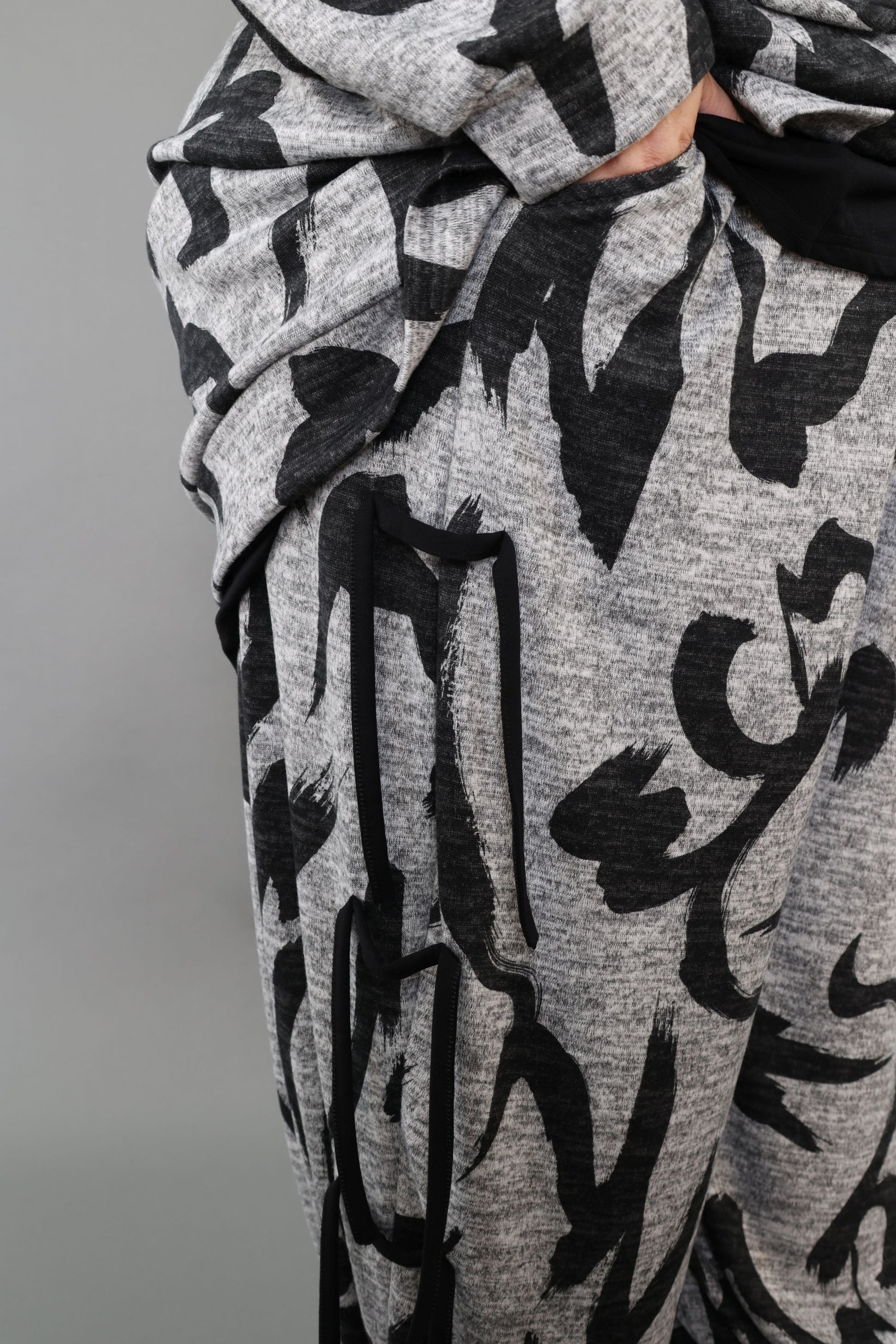 Step into style with these fun balloon pants—perfect for those in-between seasons! Made from a soft, warm knit blend that stretches with you, they keep you comfy all day long. The cool grey and dark grey brushstroke print adds a lively twist to your look. With snug elastic cuffs and quirky fringed side panels, these pants stand out. Plus, handy wing pockets add a practical touch you’ll love.