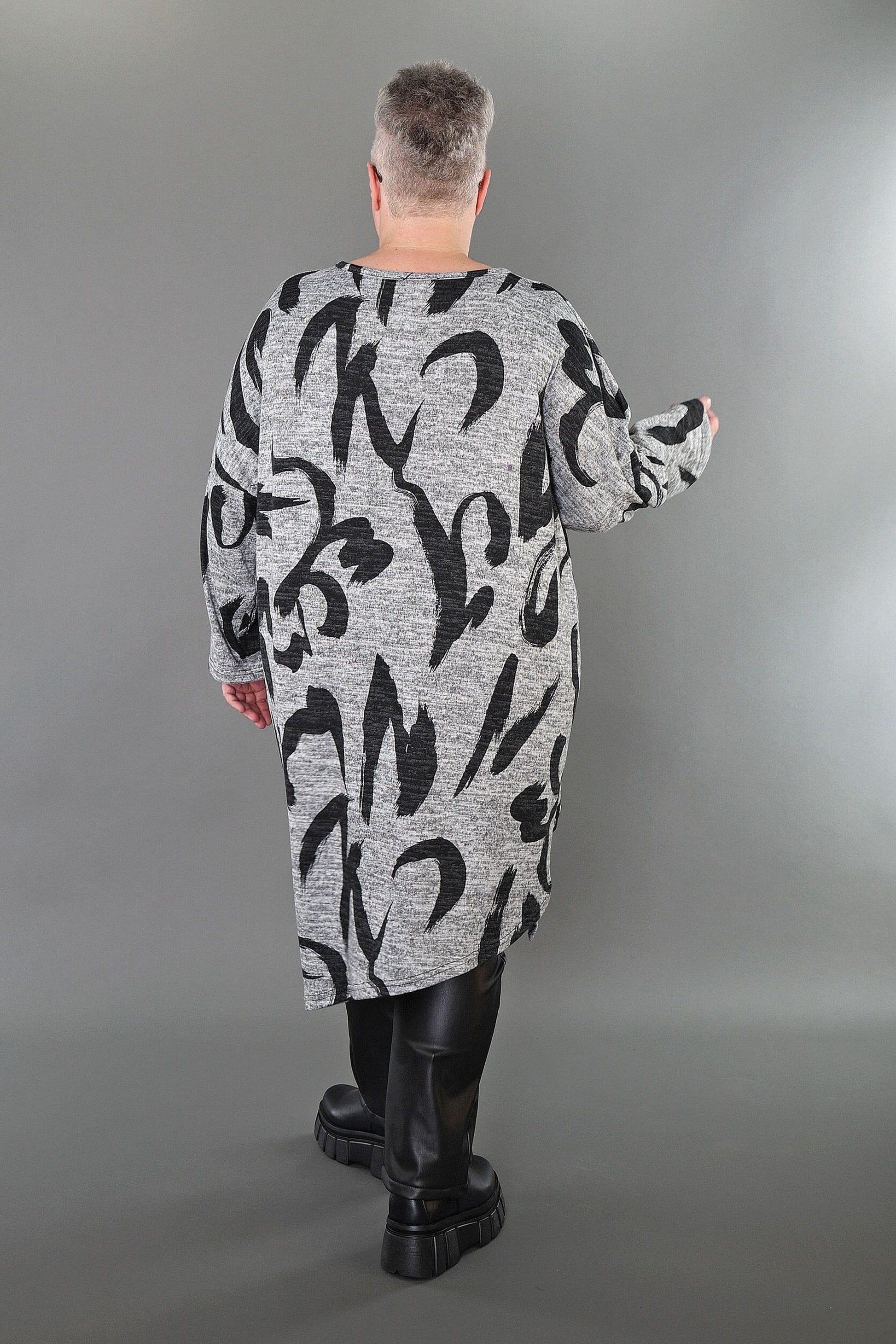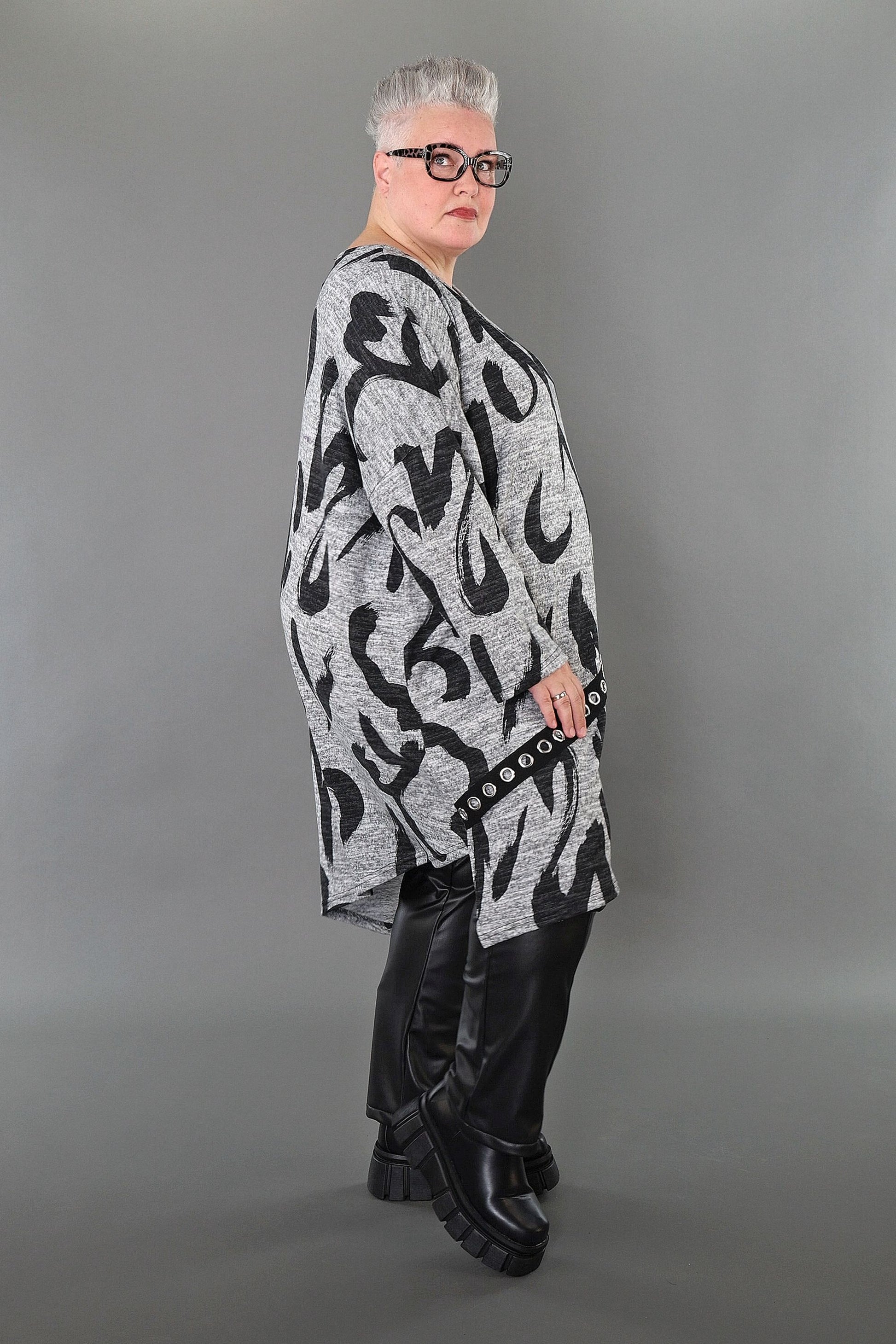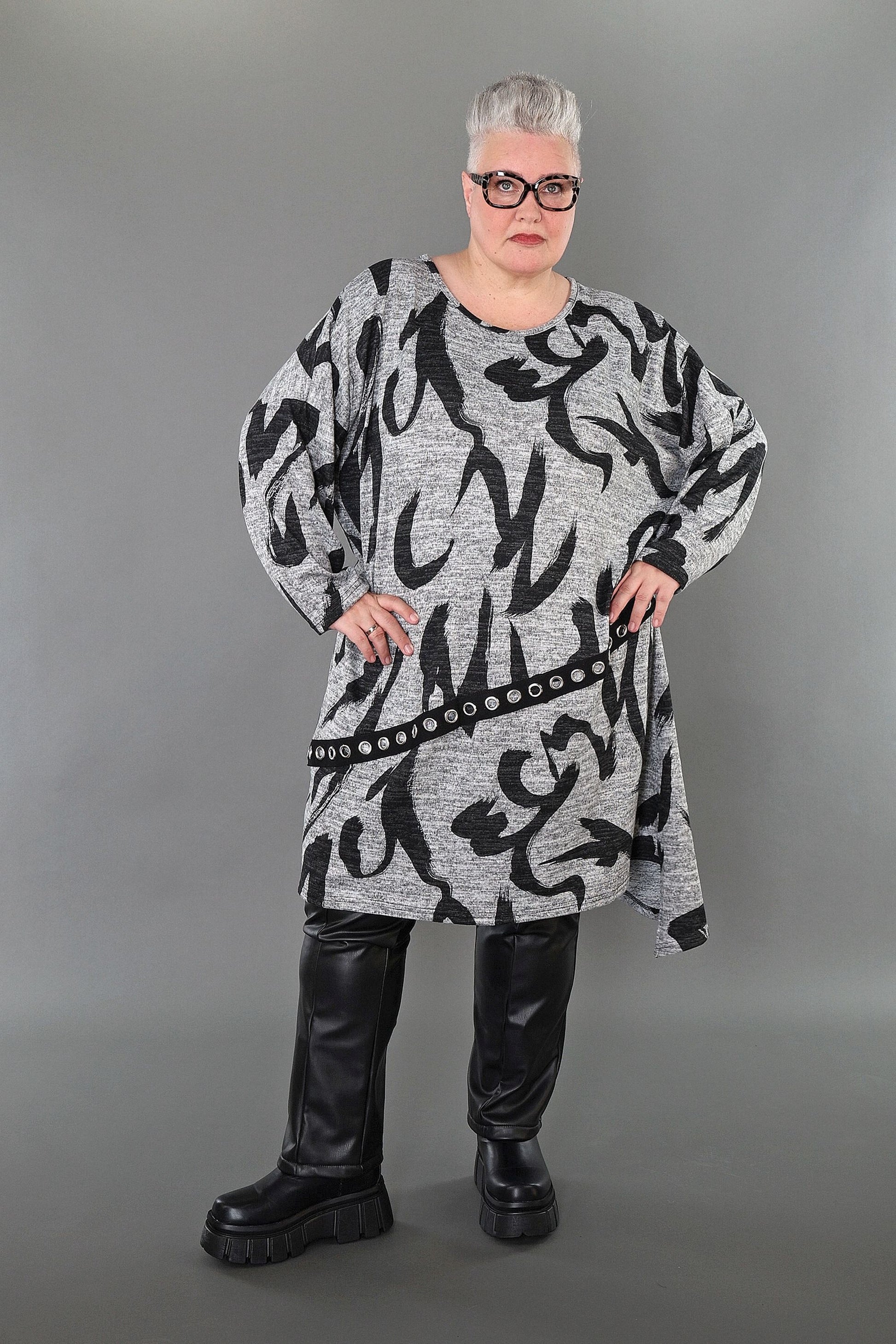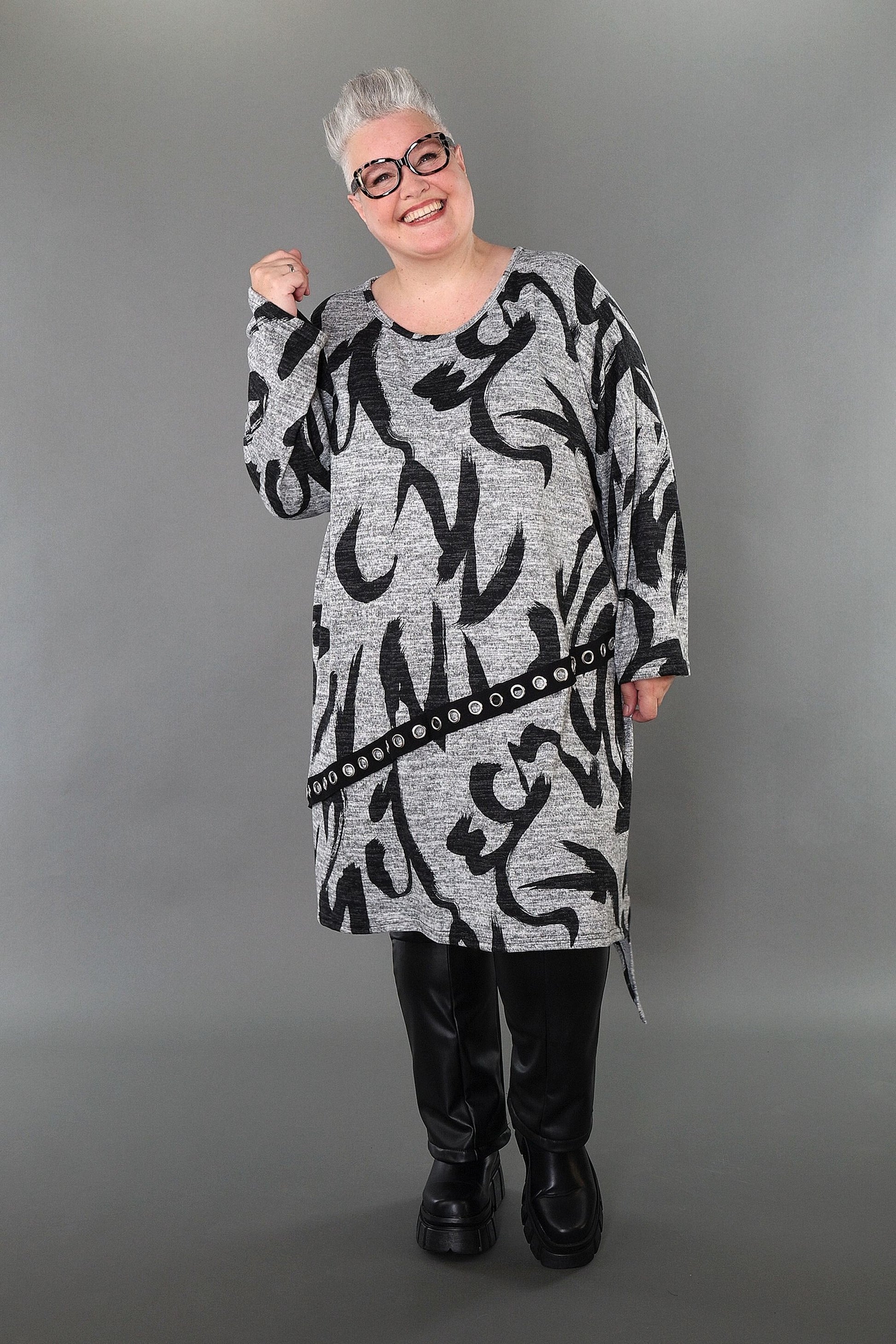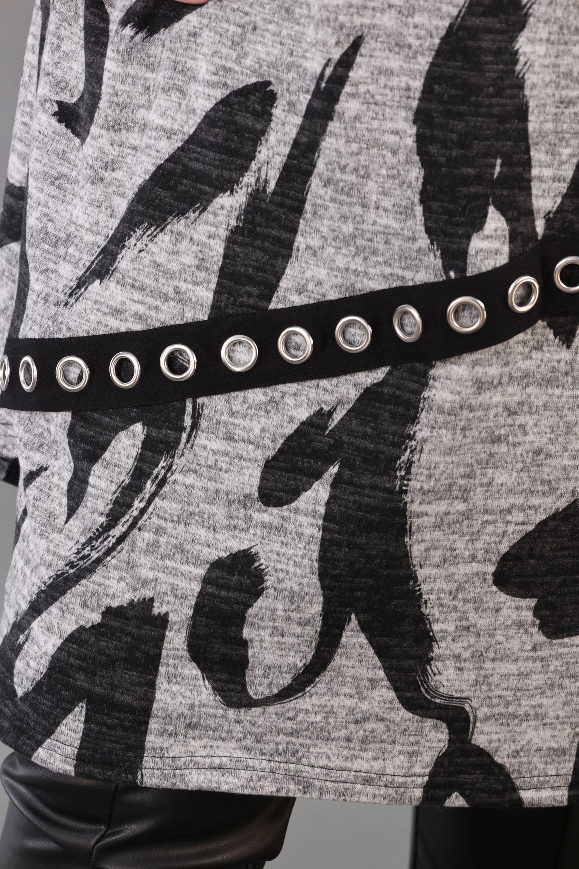 Step into style with the 7126 "Irena" Tunic—a playful twist on the classic big Tunic. Its eye-catching brushstroke pattern in cool gray tones and comfy fine knit fabric make it as cozy as it is cool. Long sleeves and a round neckline invite you to layer up during those in-between seasons, while the asymmetrical cut and charming eyelet bands give it an effortlessly fun vibe. Perfect for those who love fashion with a bit of flair!