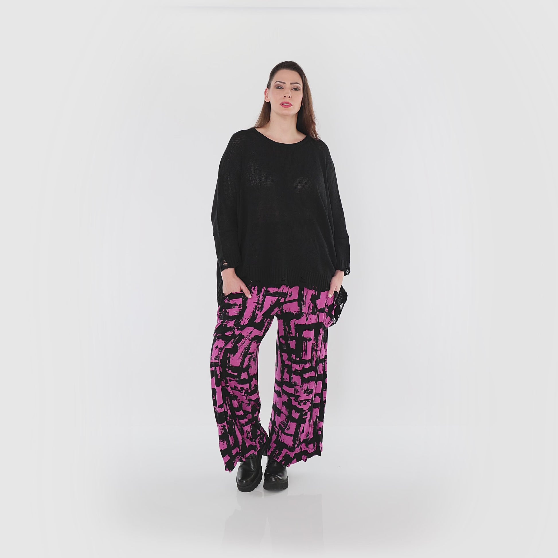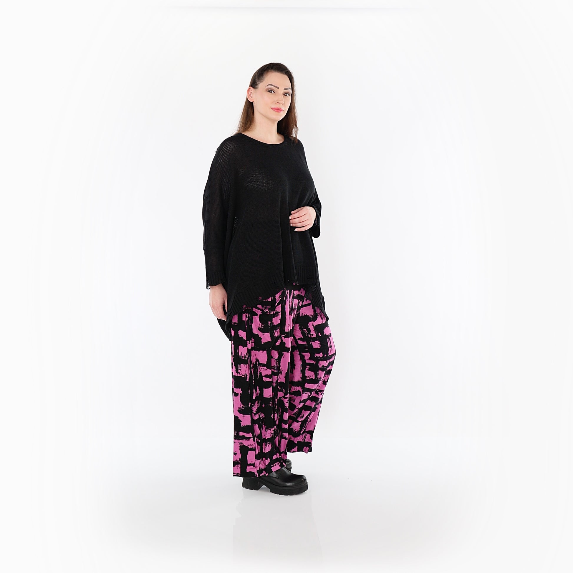 A trousers in Fuchsia, crafted from fine jersey with black accents for a soft, fluid feel. The brushstroke print lends a refined, fashion-forward finish. The balloon silhouette drapes beautifully for everyday ease.