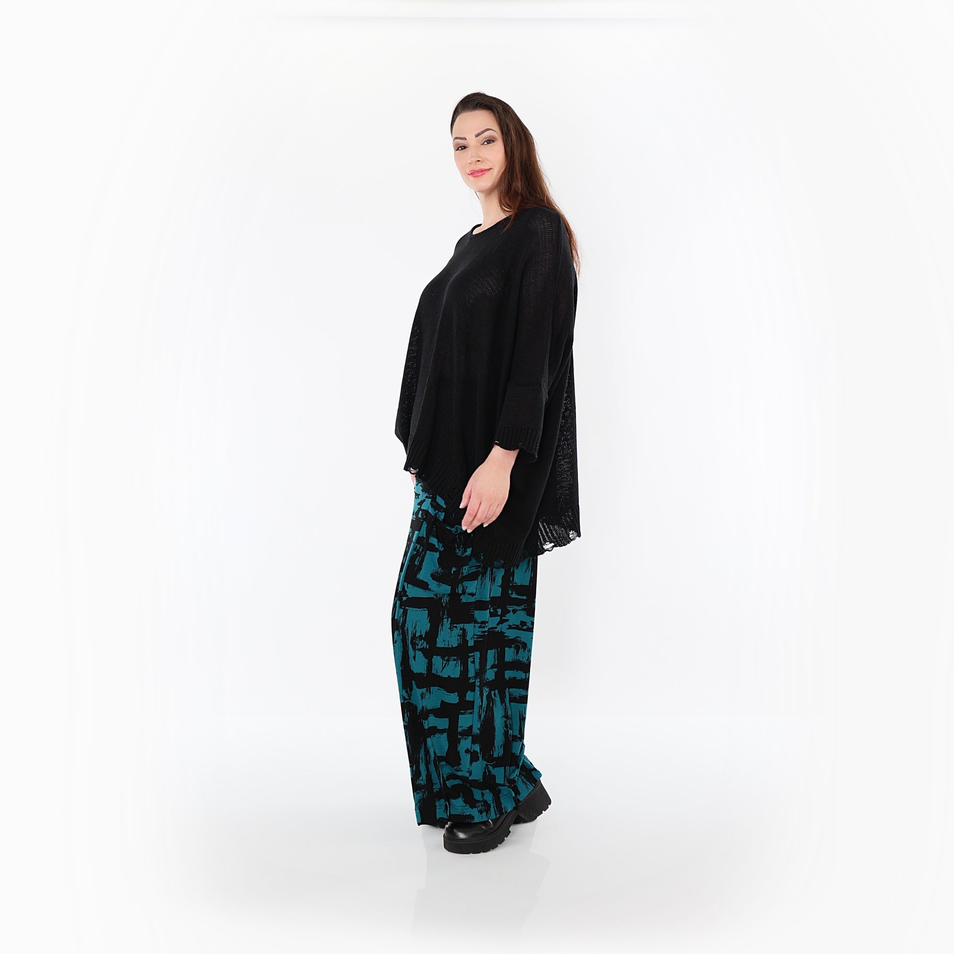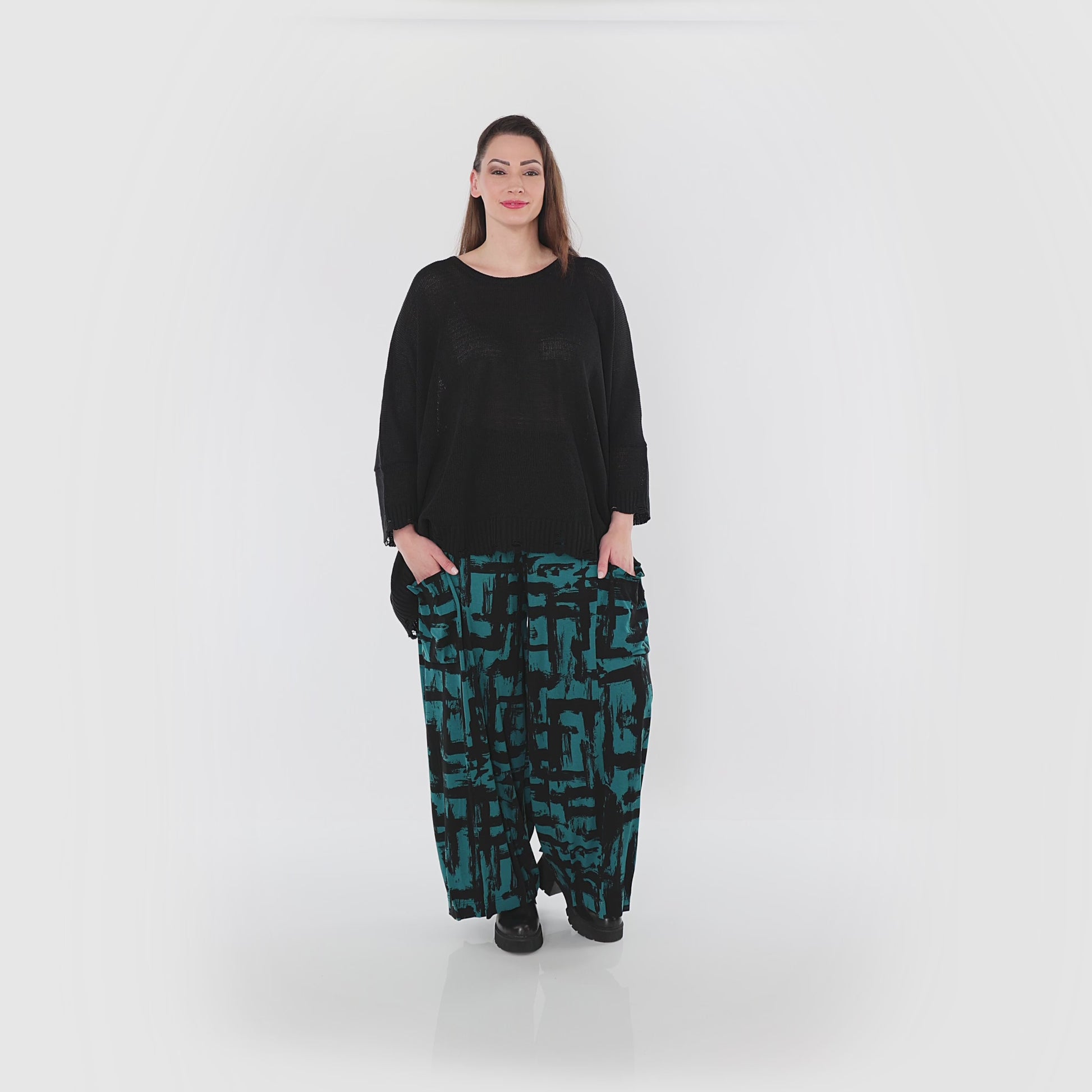 A trousers in Petrol, crafted from fine jersey with black accents for a soft, fluid feel. The brushstroke print lends a refined, fashion-forward finish. The balloon silhouette drapes beautifully for everyday ease.