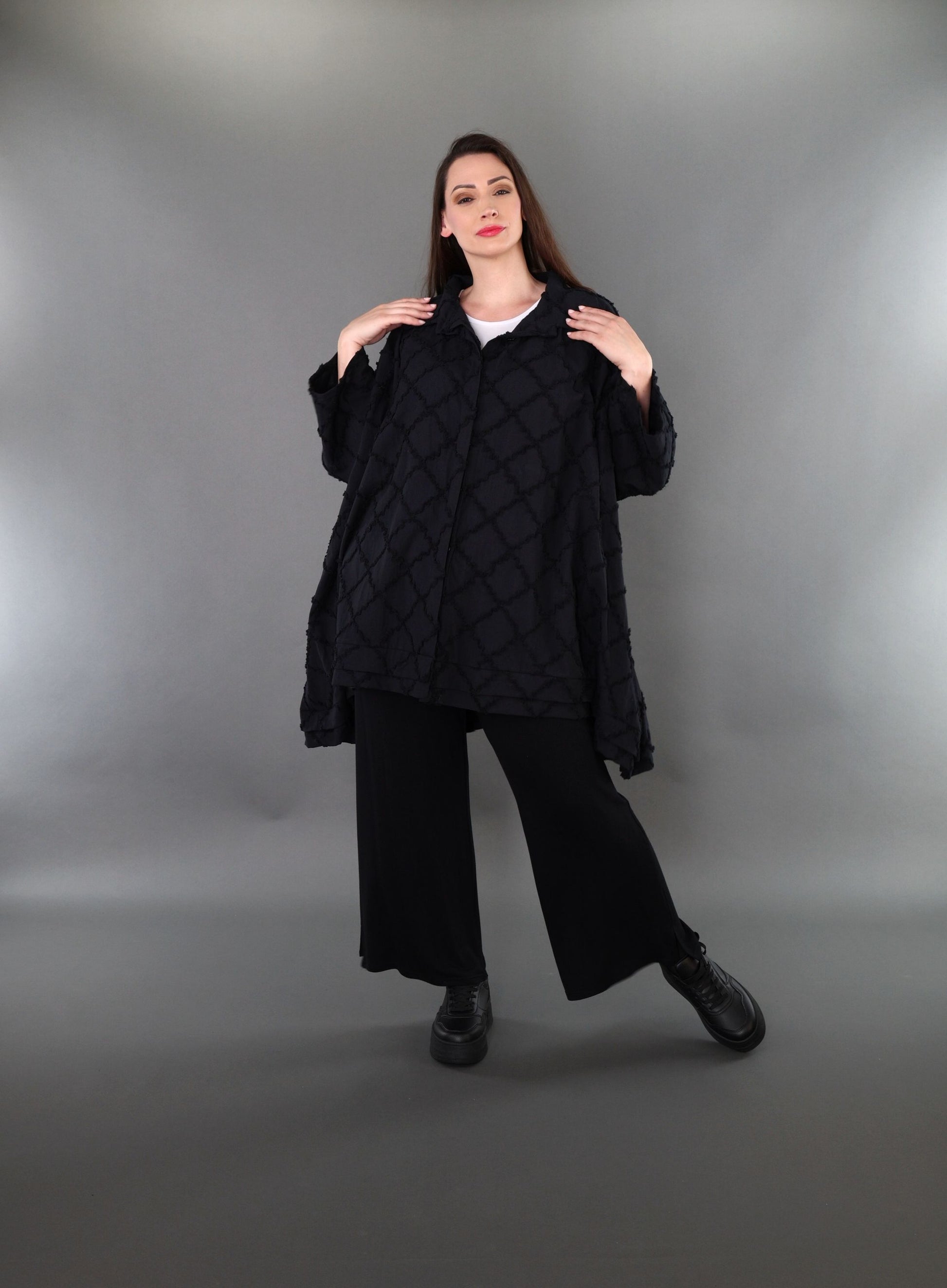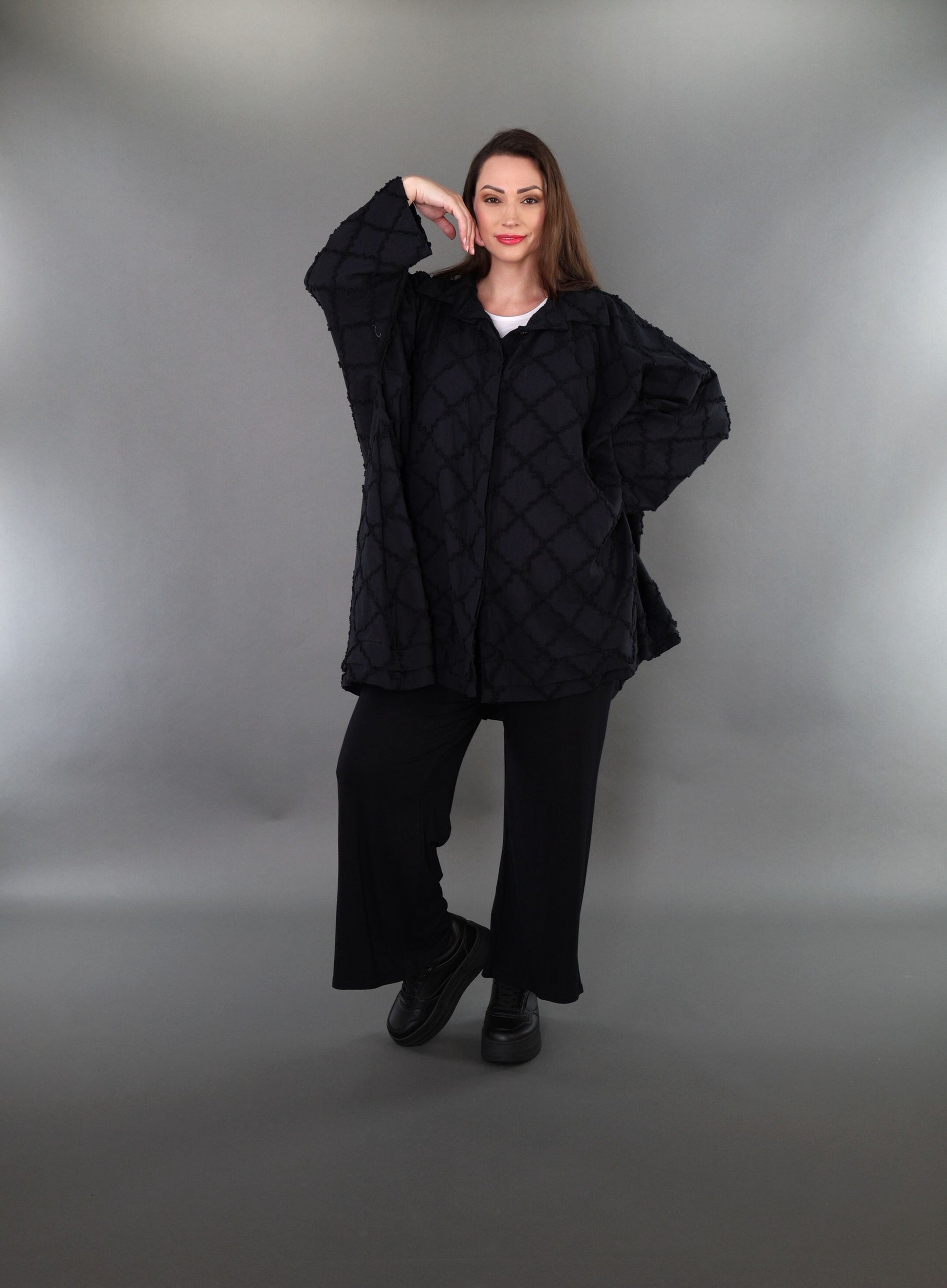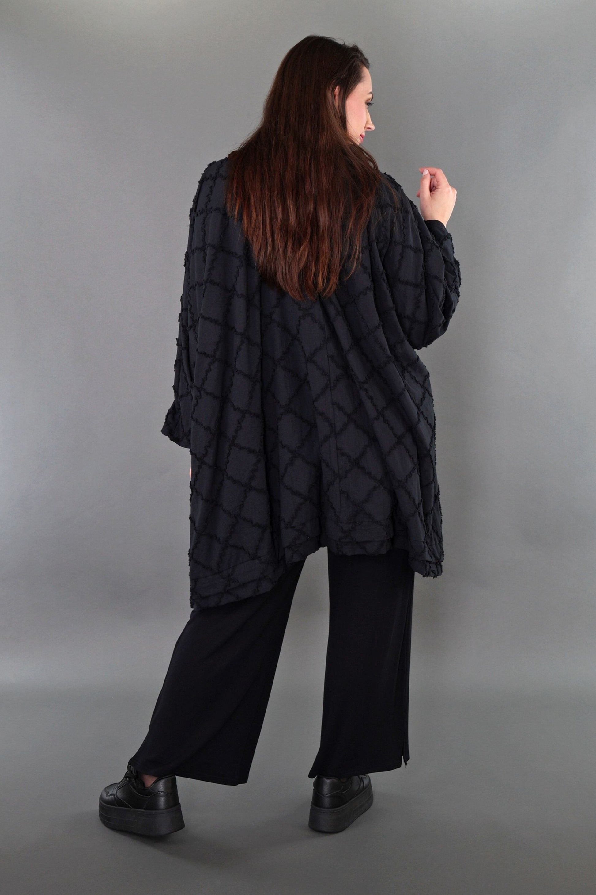 Worn by our model Regina (UK 20-24, 166cm) who can easily wear almost all AKH styles in an oversized style.
