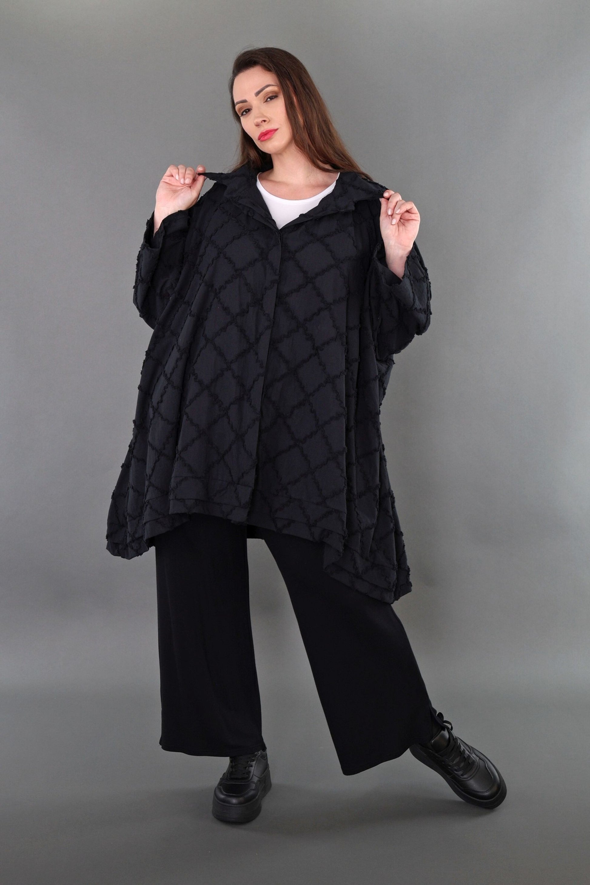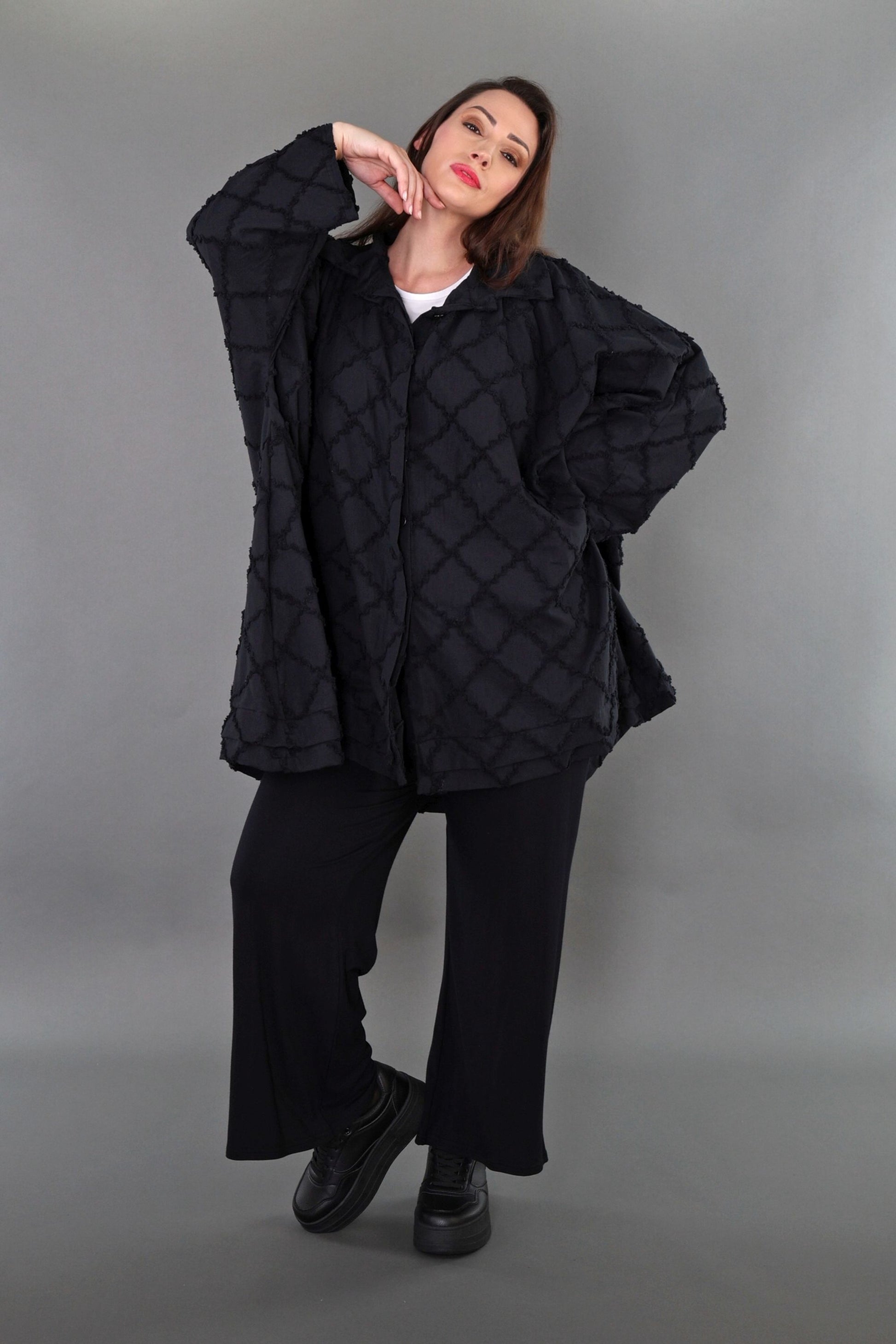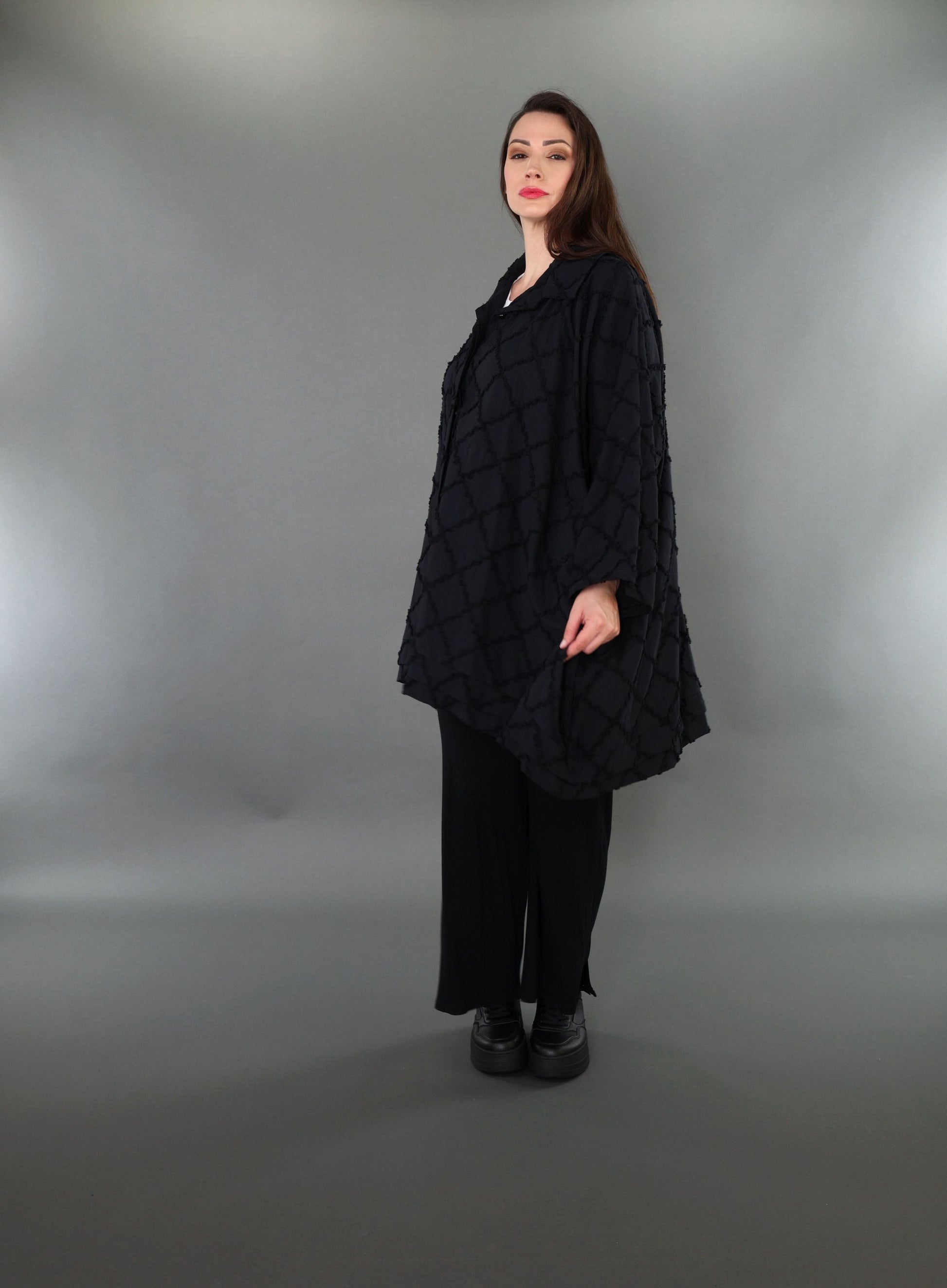 Worn by our model Regina (UK 20-24, 166cm) who can easily wear almost all AKH styles in an oversized style.