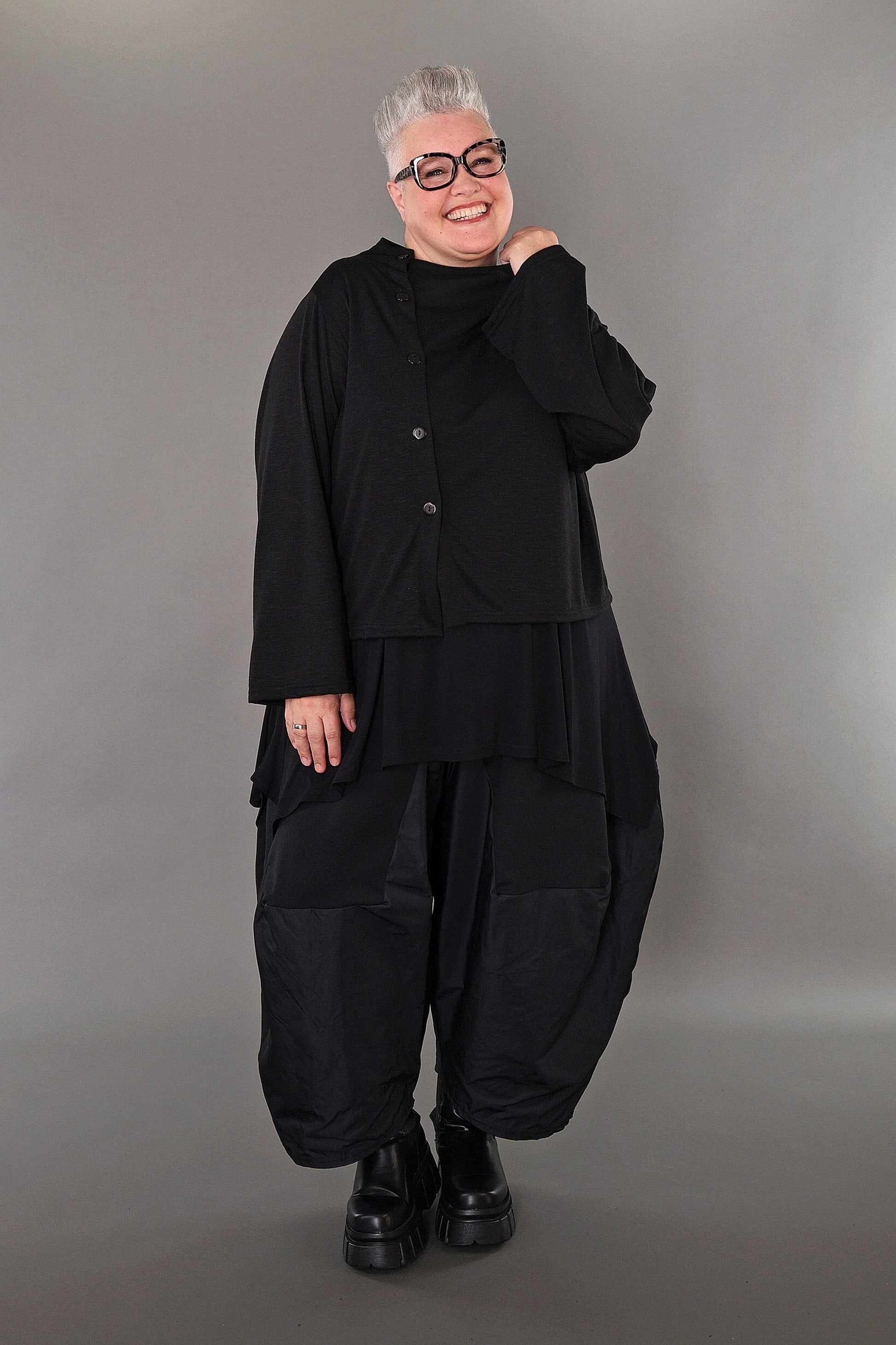Jacket description AKH transition jacket in a straight shape made of soft fine knit quality. One size fits all, wearable up to EU size 52, is also popular with customers with smaller sizes for oversized or loose, casual wear.